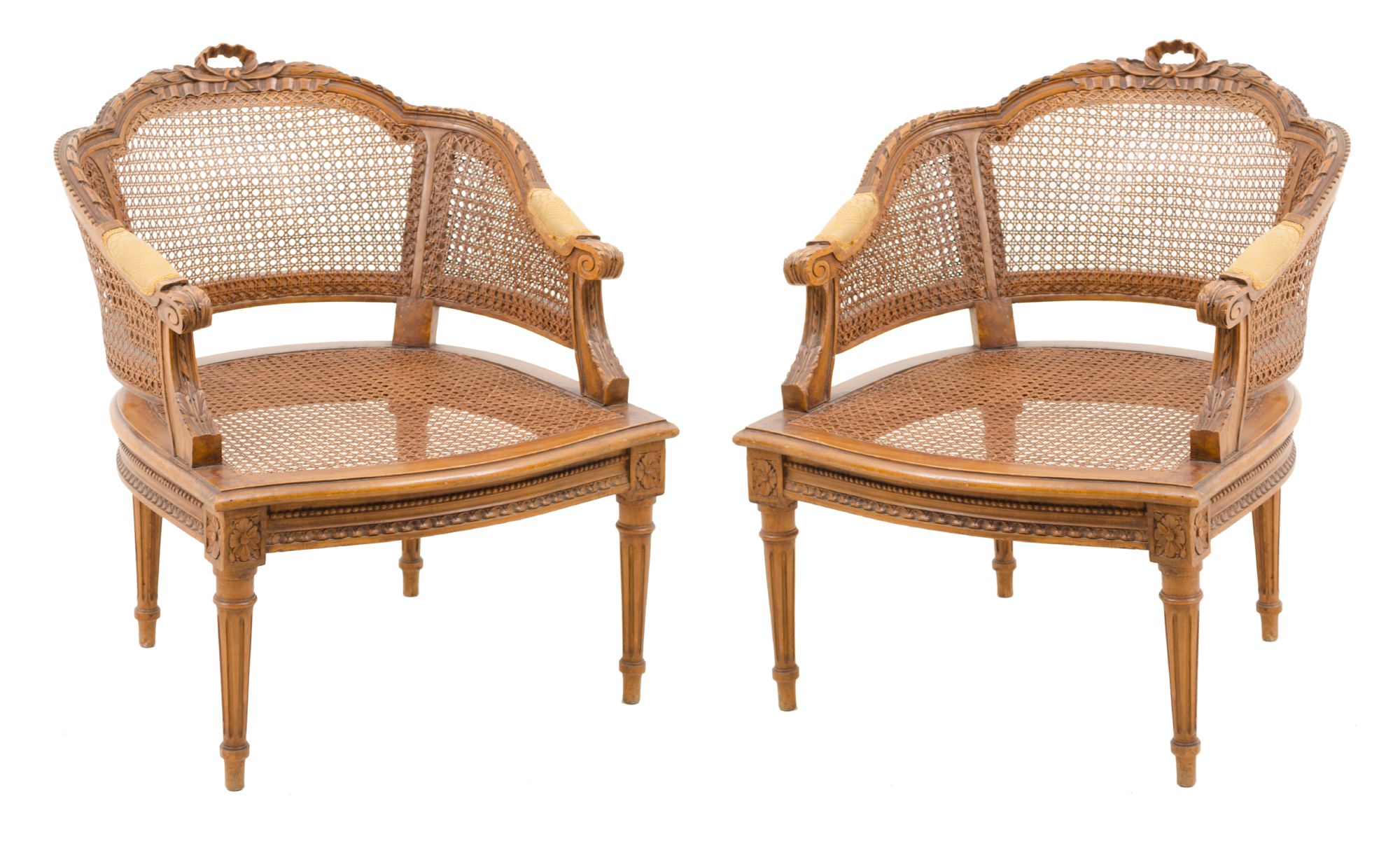 COPPIA POLTRONE in noce con sedute e spalliere in finocchino. XX secolo...