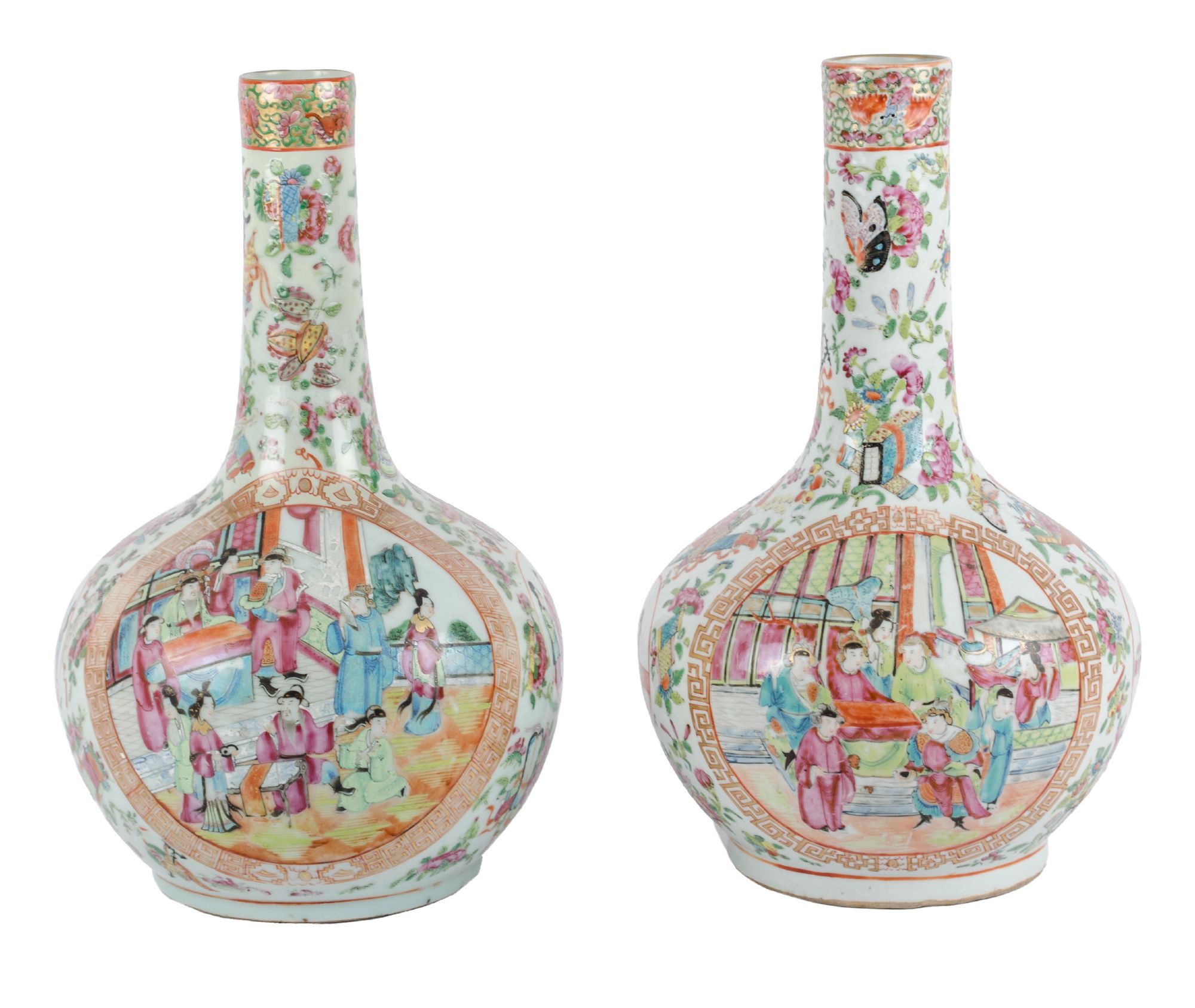 COPPIA BOTTIGLIE in porcellana decorata a motivo floreale con medaglioni raffiguranti "scene di vita orientale". Cina XIX secolo Misure: h cm 40