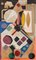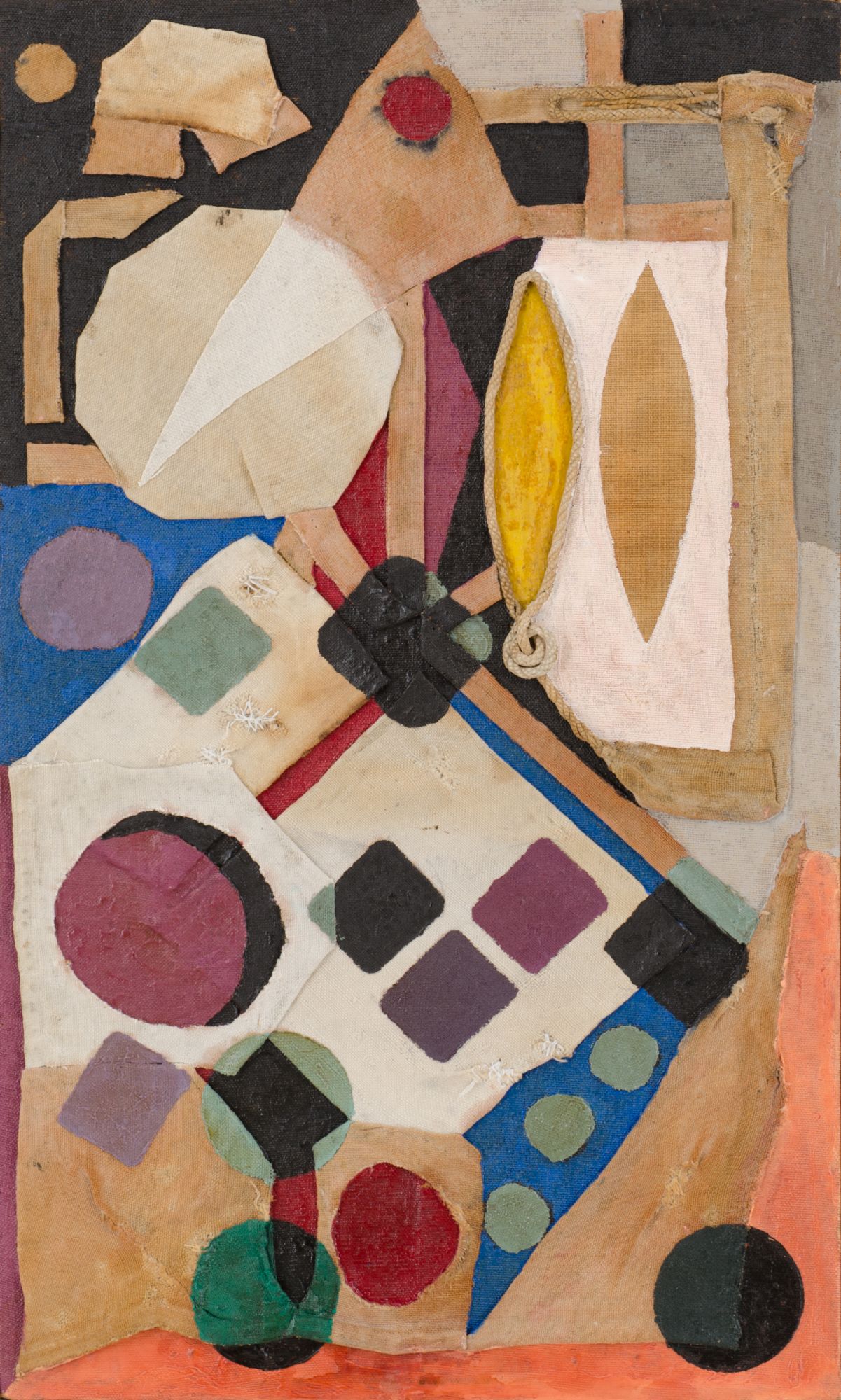 OPERA su tavola realizzata con applicazioni di frammenti di tessuti a tagli geometrici dipinti. Arte Informale del XX secolo Misure: cm 72 x 43