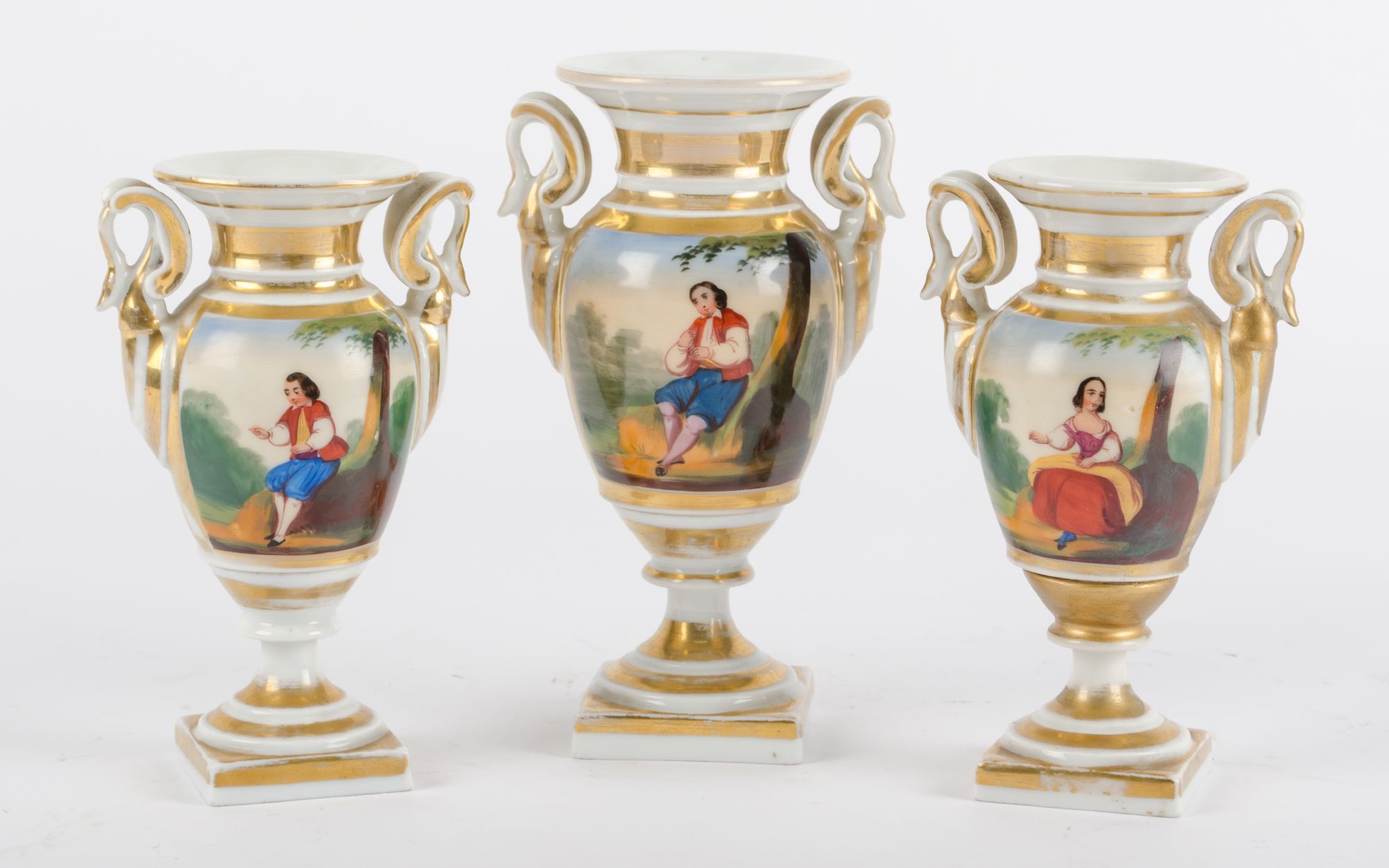 TRE VASI Impero in porcellana dipinta a mano raffigurante "paesaggi con presonaggi". Francia primi '800 Misure: h cm 19 - 17