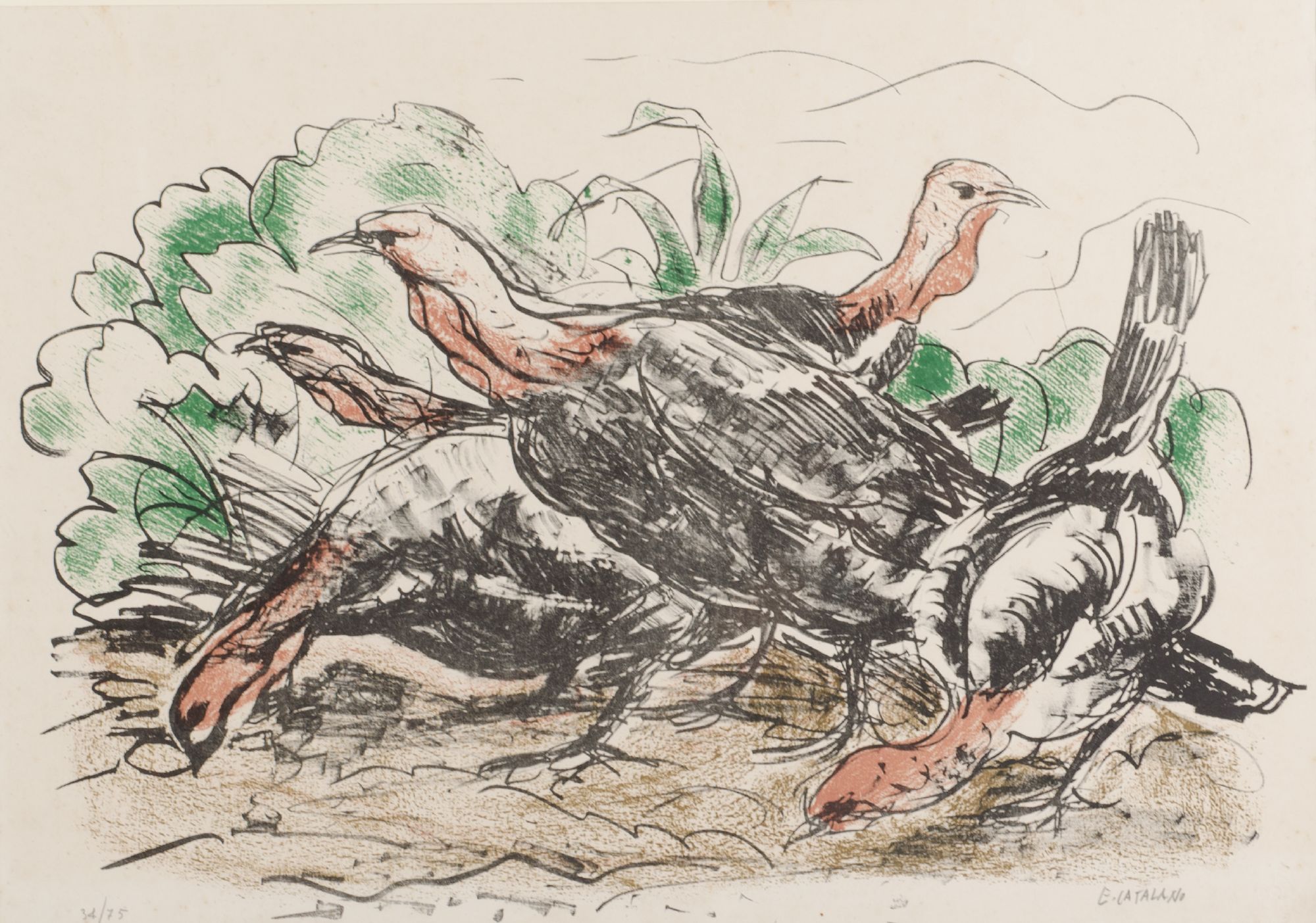 EUSTACHIO CATALANO (Palermo 1893 - 1975) LITOGRAFIA a colori "fagiani", esemplare 34/75. Misure: cm 60 x 80