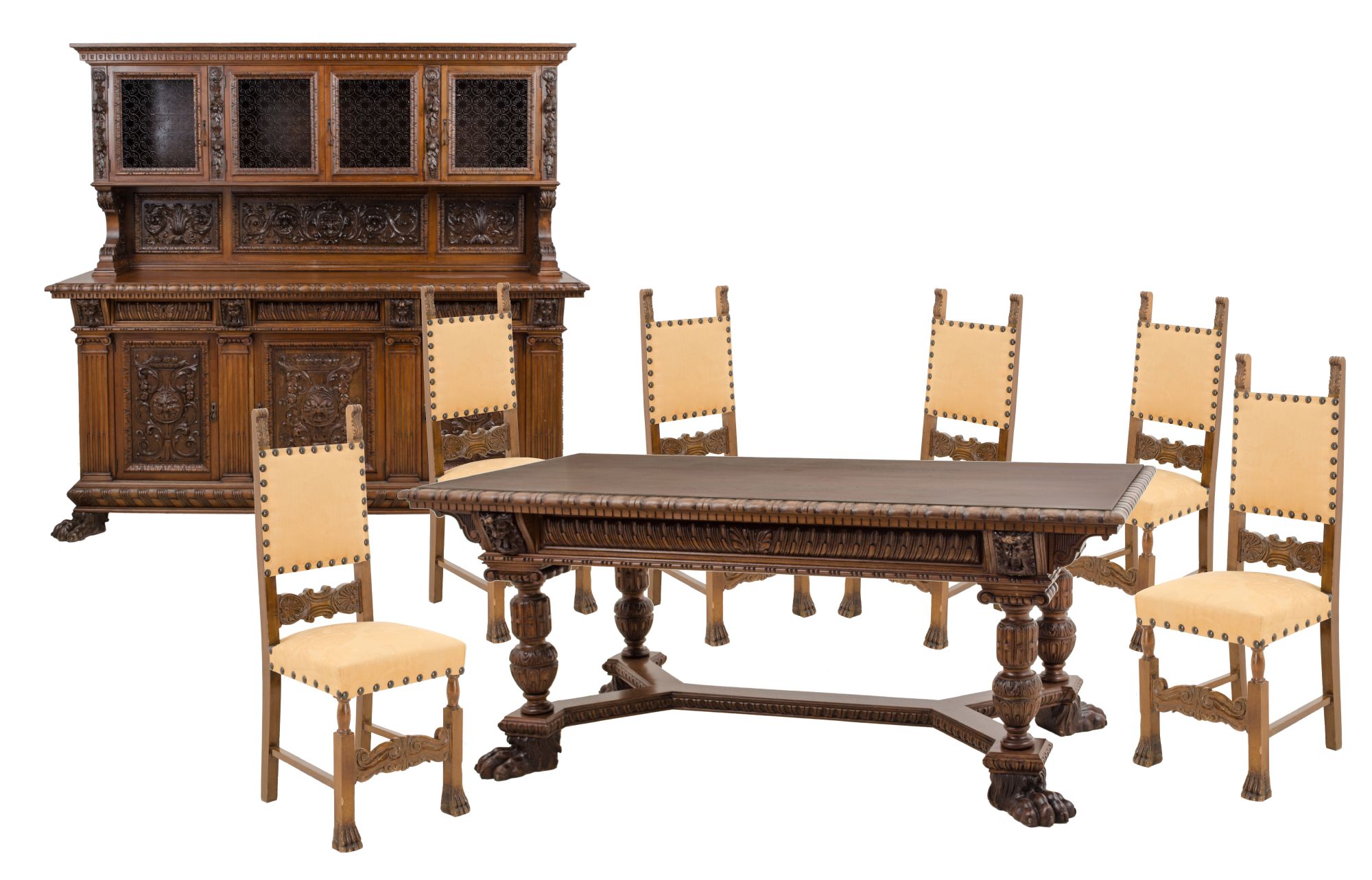 STANZA da pranzo composta da BUFFET con alzata, TAVOLO e da sei SEDIE in noce stile rinascimentale. Primi '900 Misure: varie