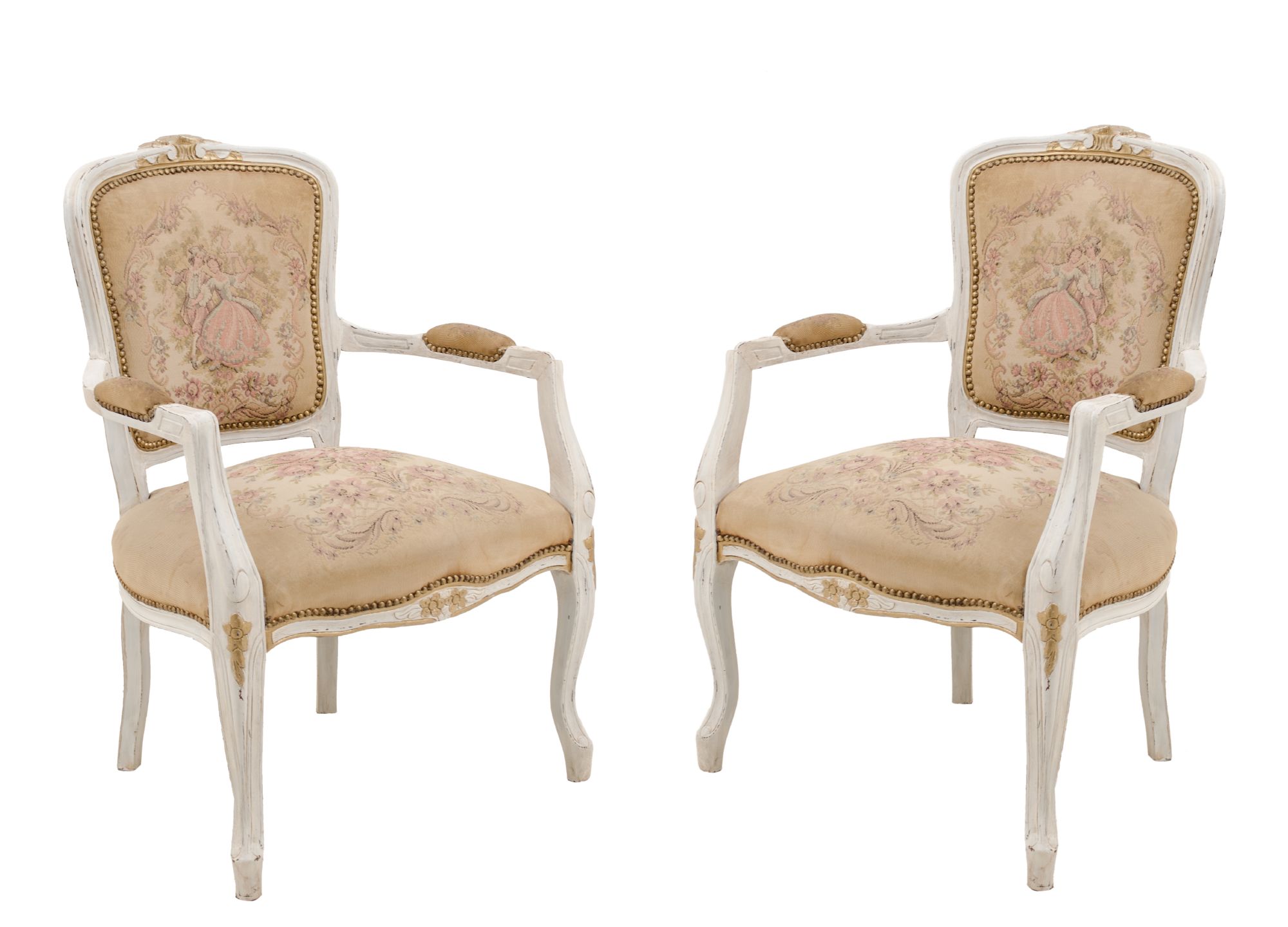 COPPIA POLTRONE stile Luigi XV in legno laccato con tappezzeria a motivo floreale (seduta h cm 50). XIX secolo Misure: h cm 89
