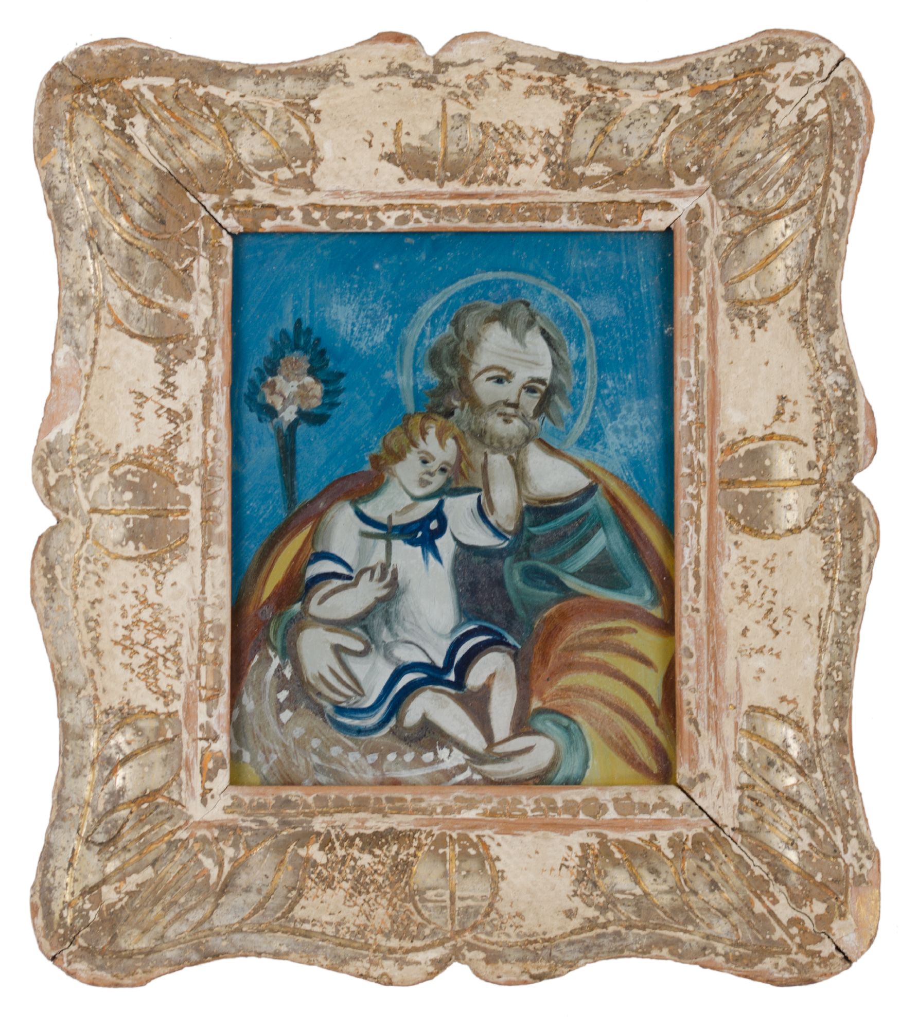 PITTURA su vetro "San Giuseppe con Bambino" entro cornice a guantiera (cm 14 x 11). Sicilia XIX secolo Misure: cm 21 x 23