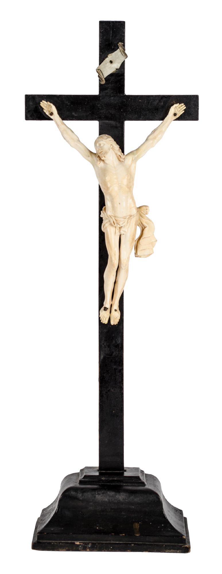CRISTO in avorio (h cm 29) montato su croce da tavolo in legno ebanizzato. Italia XVIII secolo Misure: h cm 65,5