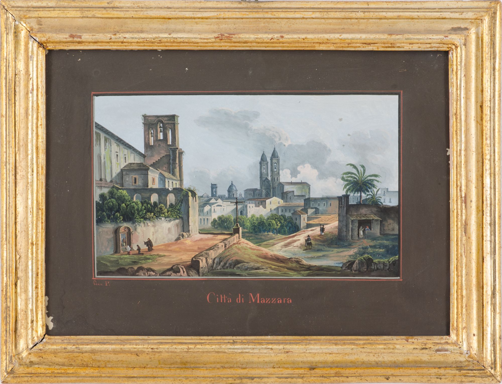 TEMPERA su carta "veduta di Mazara del Vallo con personaggi". Sicilia XVIII secolo Misure: cm 16 x 26