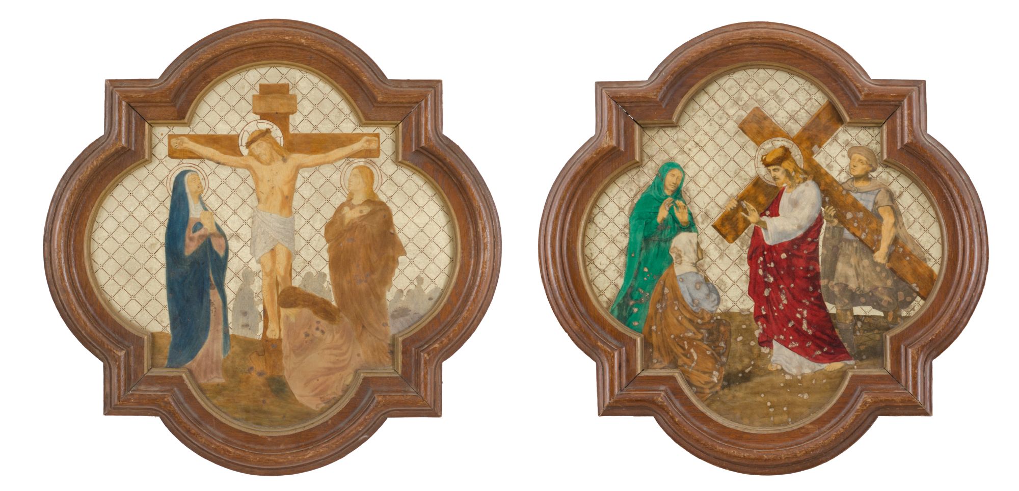 COPPIA OLI su rame "Cristo crocifisso con Madonna e Maddalena" e "Cristo aiutato a portare la croce". Francia fine XIX secolo Misure: cm 42 x 42