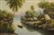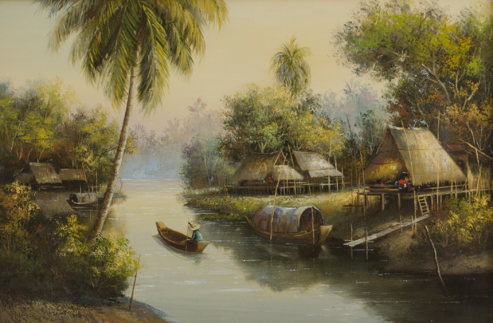 OLIO su tela "villaggio orientale con fiume ed imbarcazioni". XX secolo Misure: cm 50 x 75
