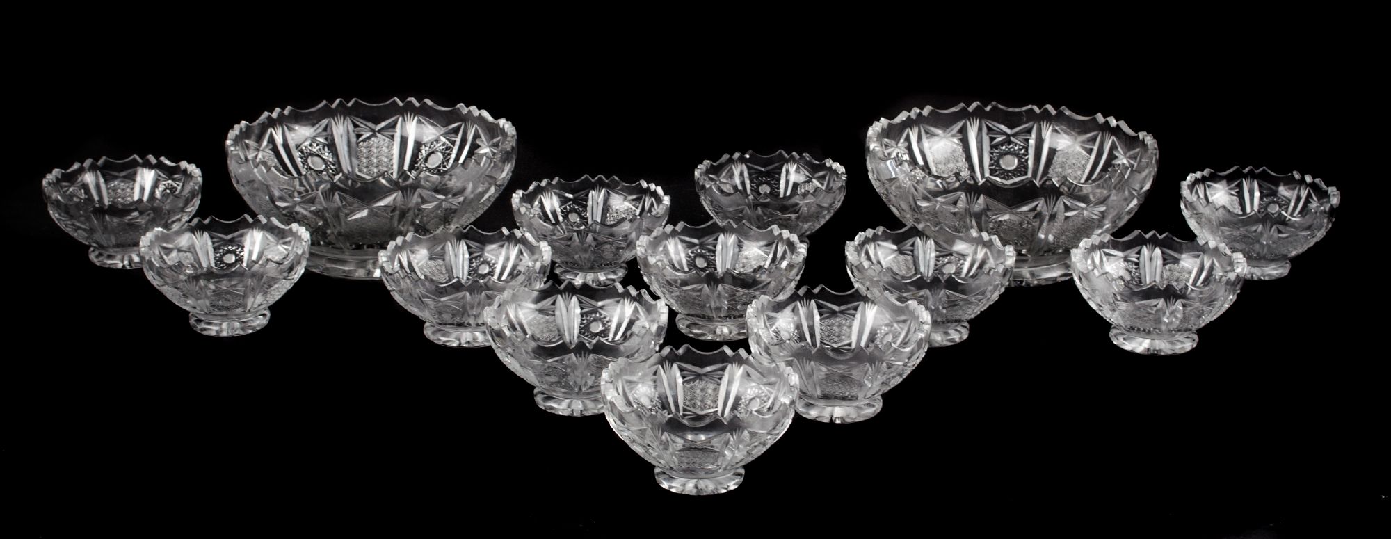 SERVIZIO da macedonia in vetro lavorato composto da 2 COPPE e da 12 COPPETTE (usure). XX secolo Misure: varie
