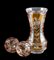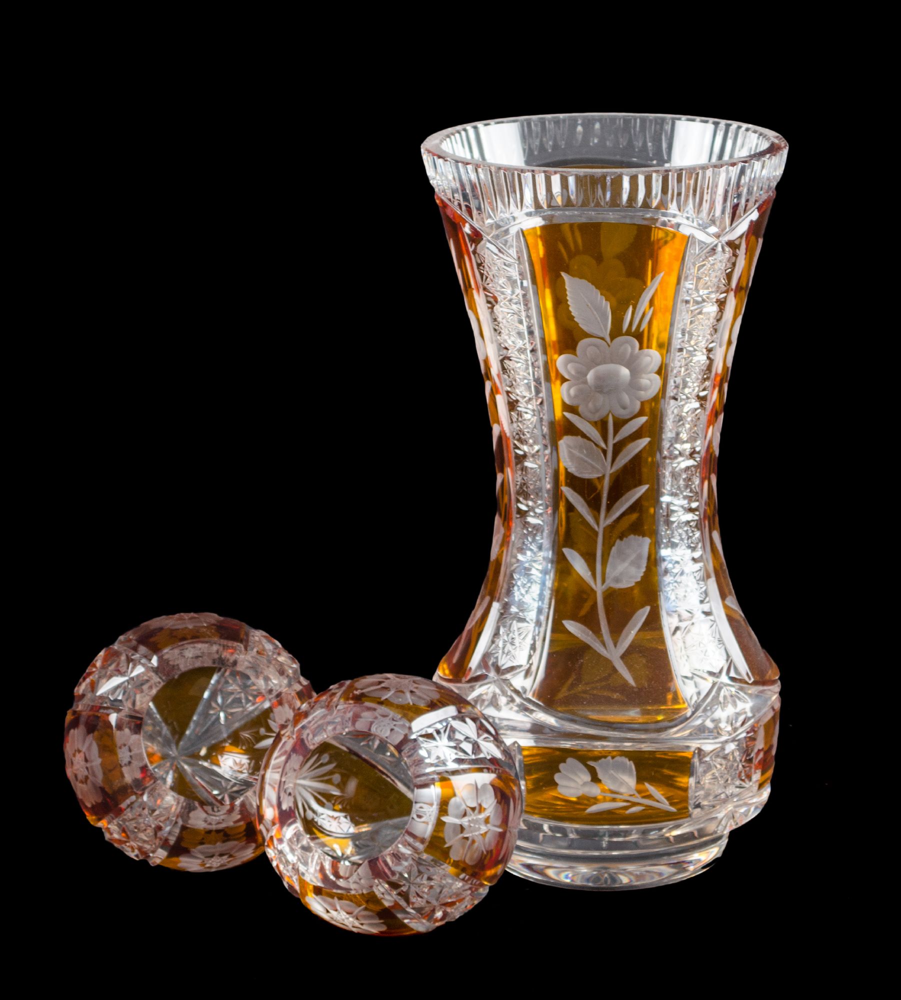 LOTTO composto da VASO in vetro inciso e lavorato a motivo floreale nei toni dell'ambra e da due POSACENERE in vetro inciso e lavorato a motivo floreale nei toni dell'ambra. XX secolo Misure: varie