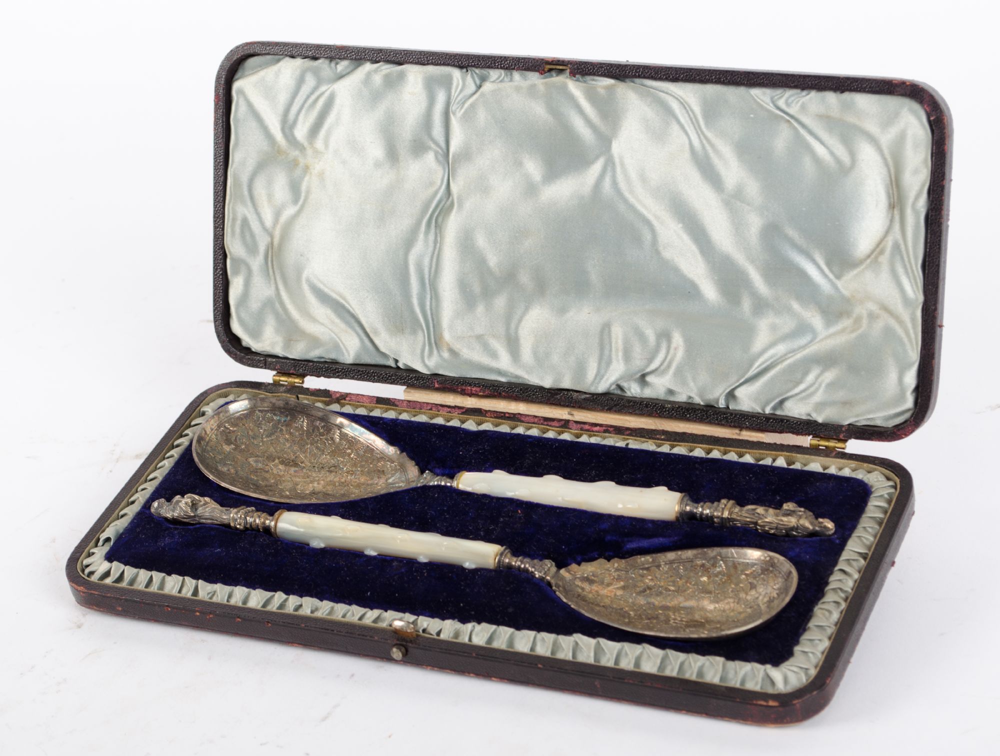 Lotto 482 | DUE POSATE in Sheffield con manici in madreperla entro cofanetto. Sheffield...