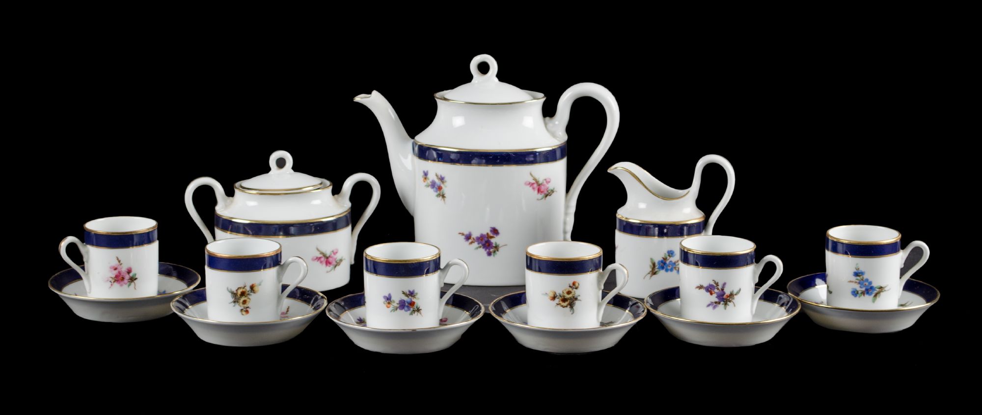 SERVIZIO da caffe' in porcellana Ginori nei toni del bianco e del blu cobalto decorato a motivo floreale e lumeggiato in oro composto da CAFFETTIERA, LATTIERA, ZUCCHERIERA e da sei TAZZINE con piattini. XX secolo Misure: varie