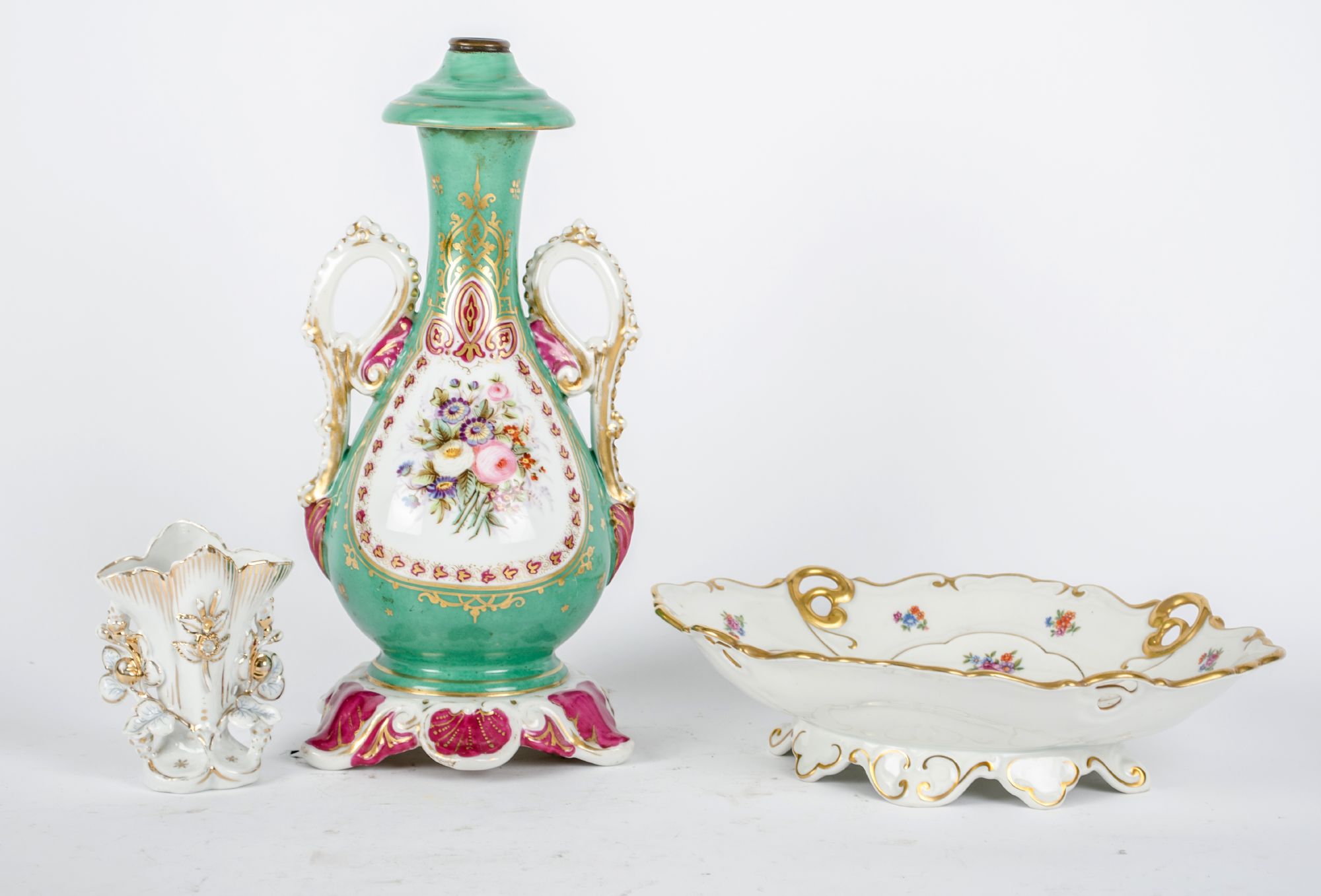 LOTTO composto da CENTROTAVOLA in porcellana tedesca decorata e da LUME in porcellana decorata a motivo floreale e fogliaceo. XX secolo Misure: varie