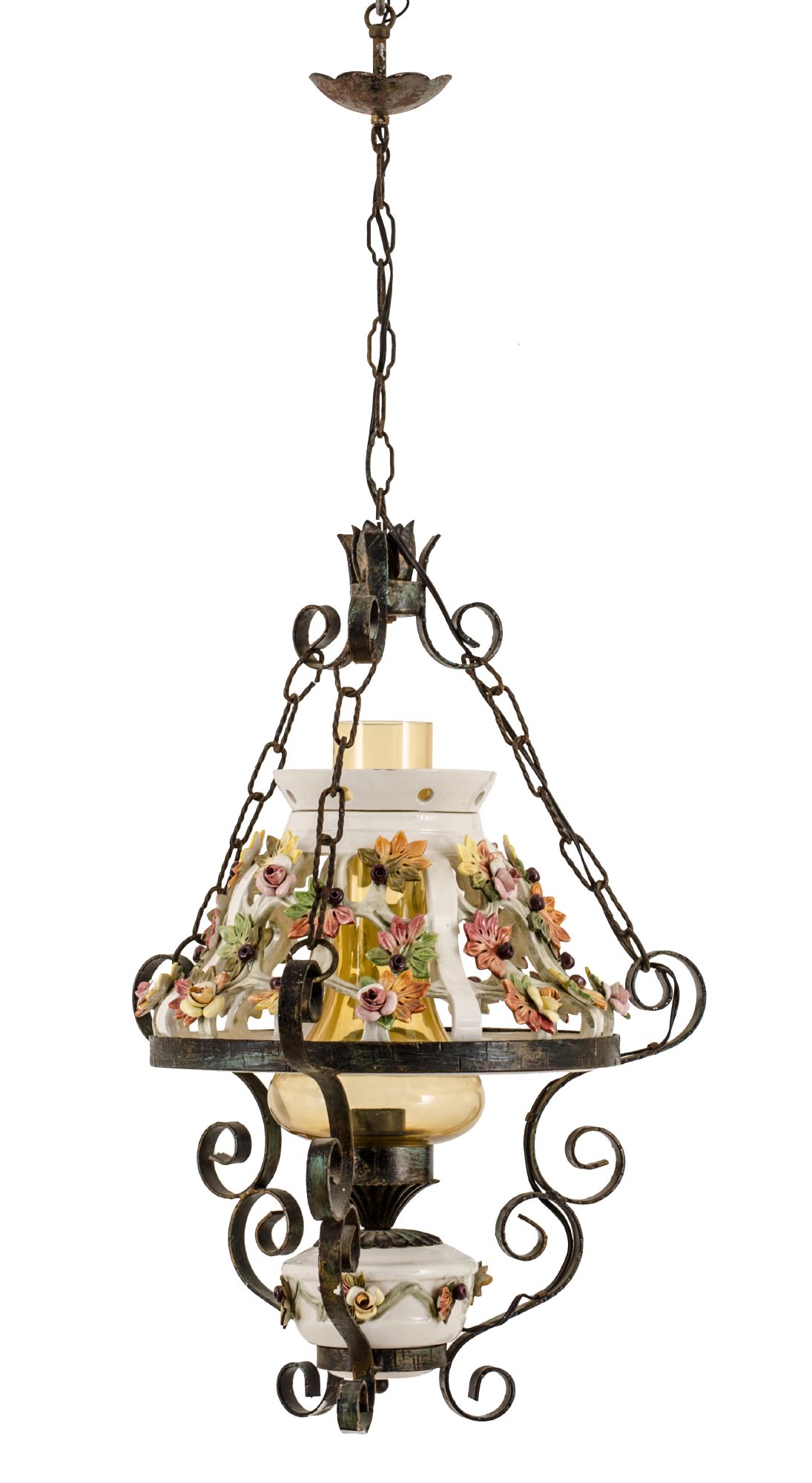 LAMPADARIO ad una luce in porcellana policroma e ferro battuto (mancanze)....