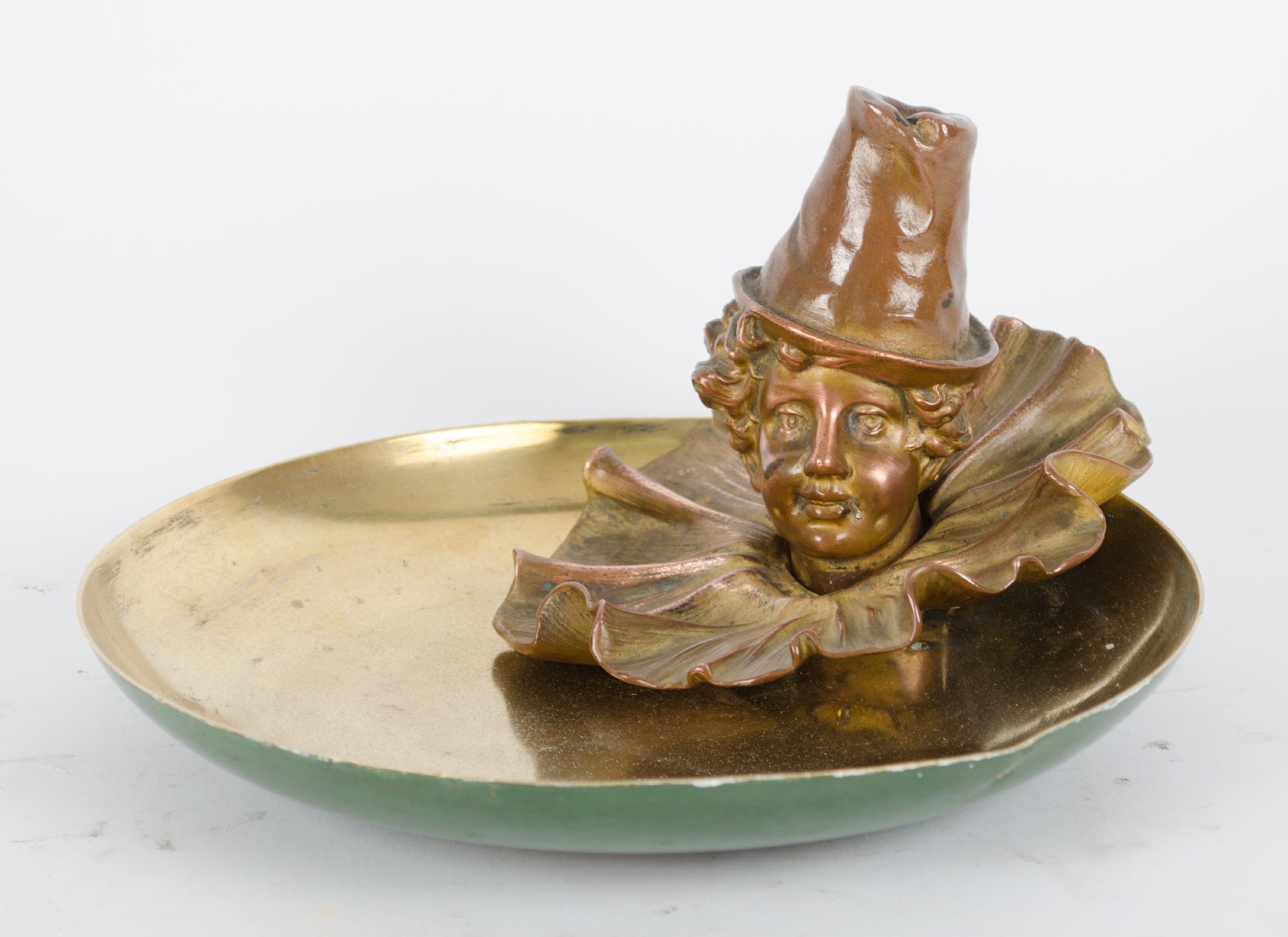 SVUOTATASCHE in bronzo con scultura raffigurante "Pierrot". Italia primi '900...