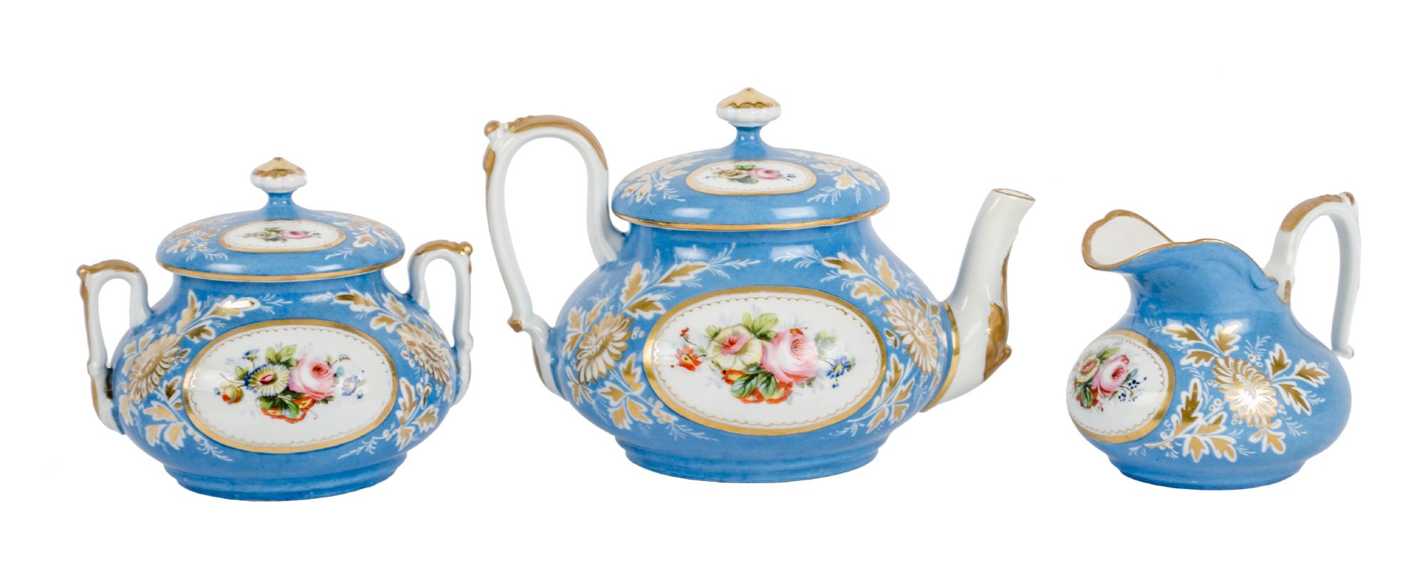 SERVIZIO da the composto da THEIERA, LATTIERA e da ZUCCHERIERA in porcellana nei toni del turchese dipinta a mano a motivo floreale e riccamente lumeggiata in oro. Francia XIX secolo Misure: varie