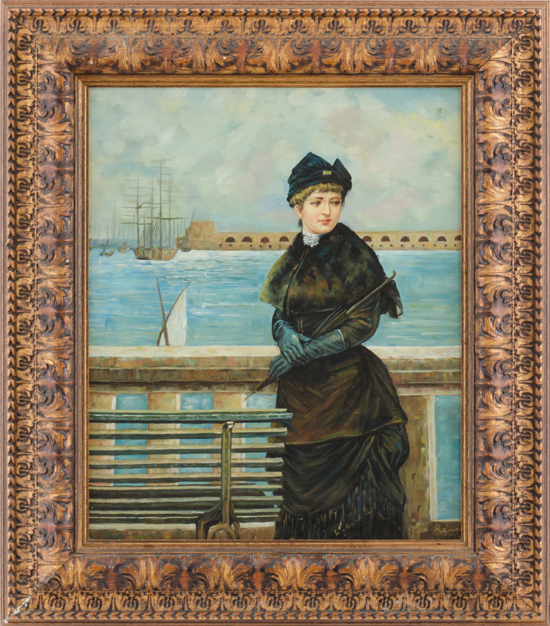 OLIO su tela "gentildonna sul lungo mare", firmato in basso a destra. XX...