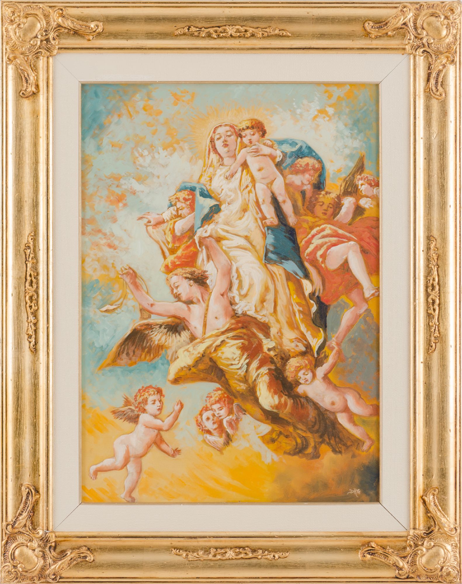 OLIO su tela "Madonna con Bambino e putti". XX secolo Misure: cm 70 x 50