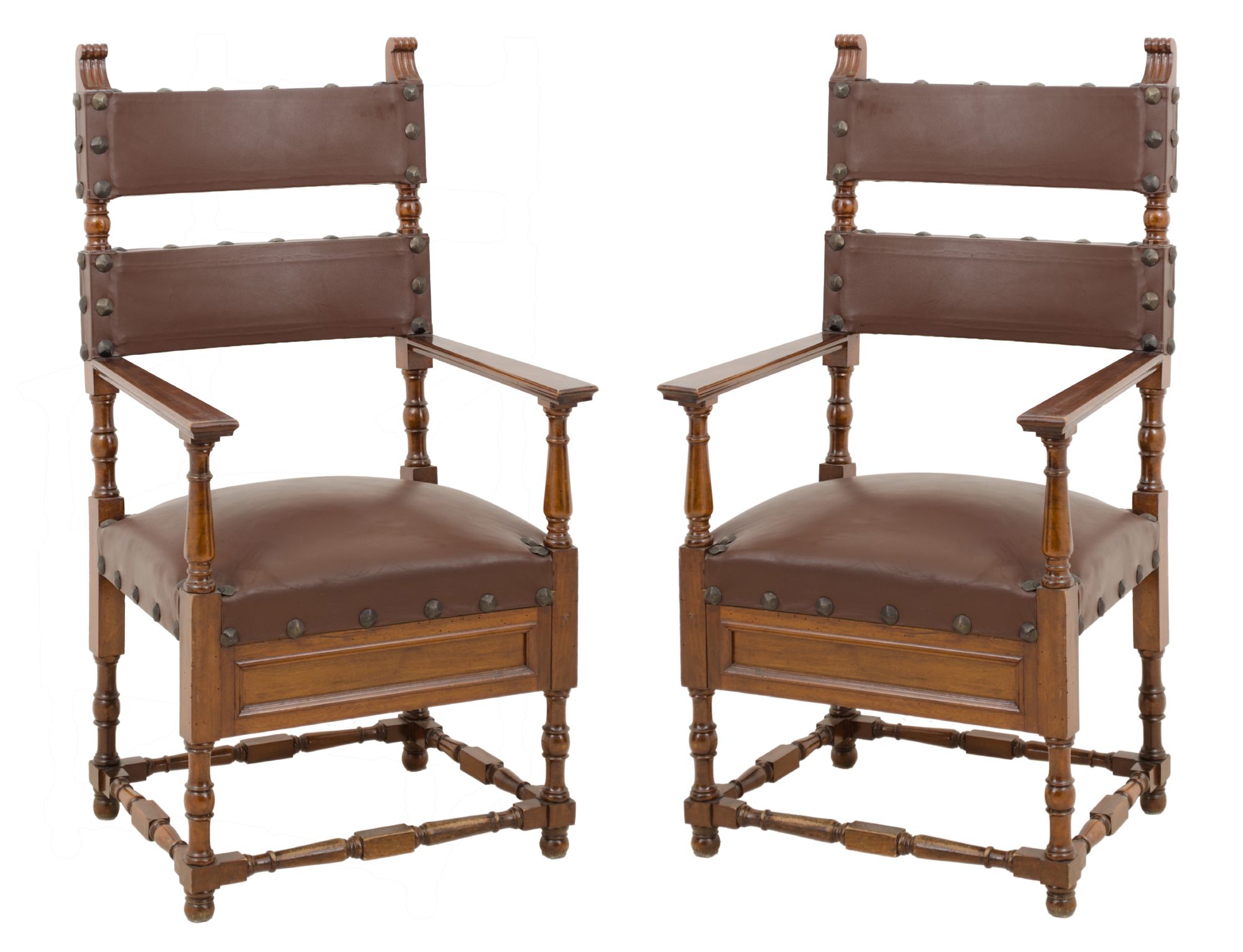 COPPIA POLTRONE stile rinascimentale in noce con seduta e spalliera in vilpelle. Sicilia primi '900 Misure: cm 63 x 55 x h 121