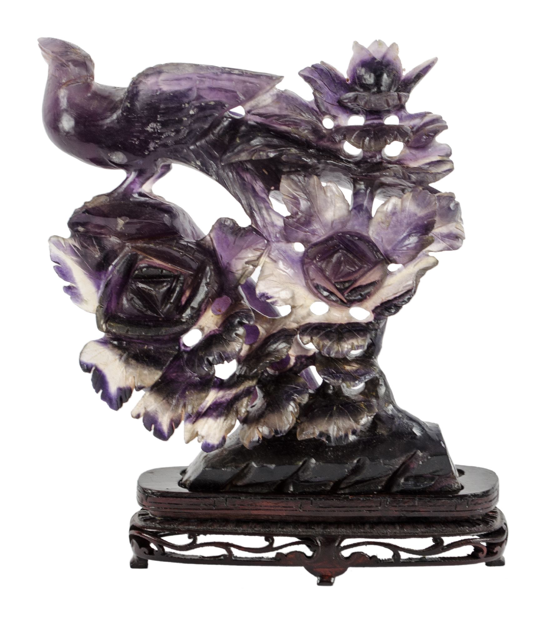 SCULTURA in agata raffigurante "volatile su ramo fiorato", base in legno. Cina XX secolo Misure: h cm 21