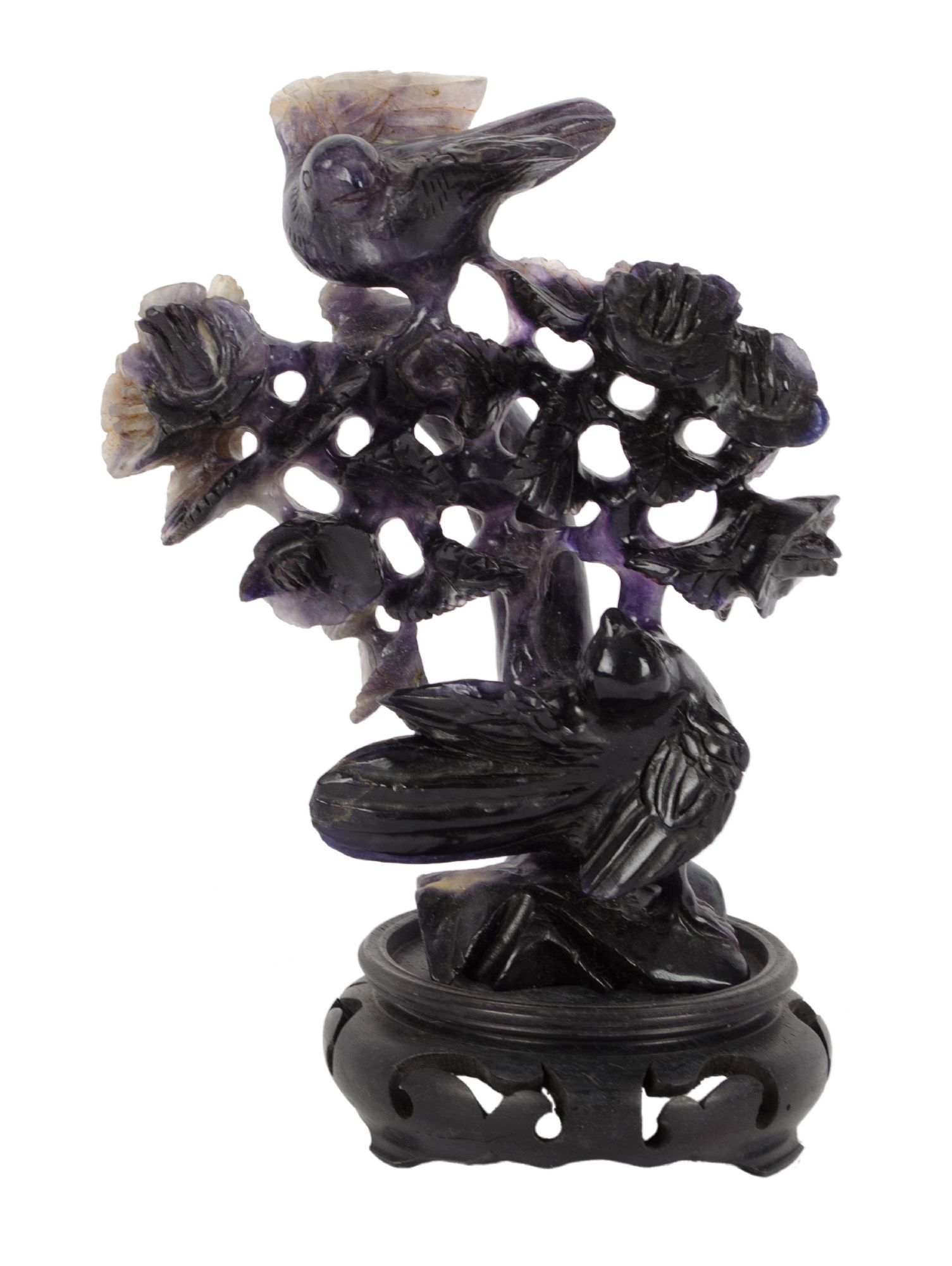 SCULTURA in ametista raffigurante "ramo con volatili", base in legno. Cina XX secolo Misure: h cm 17