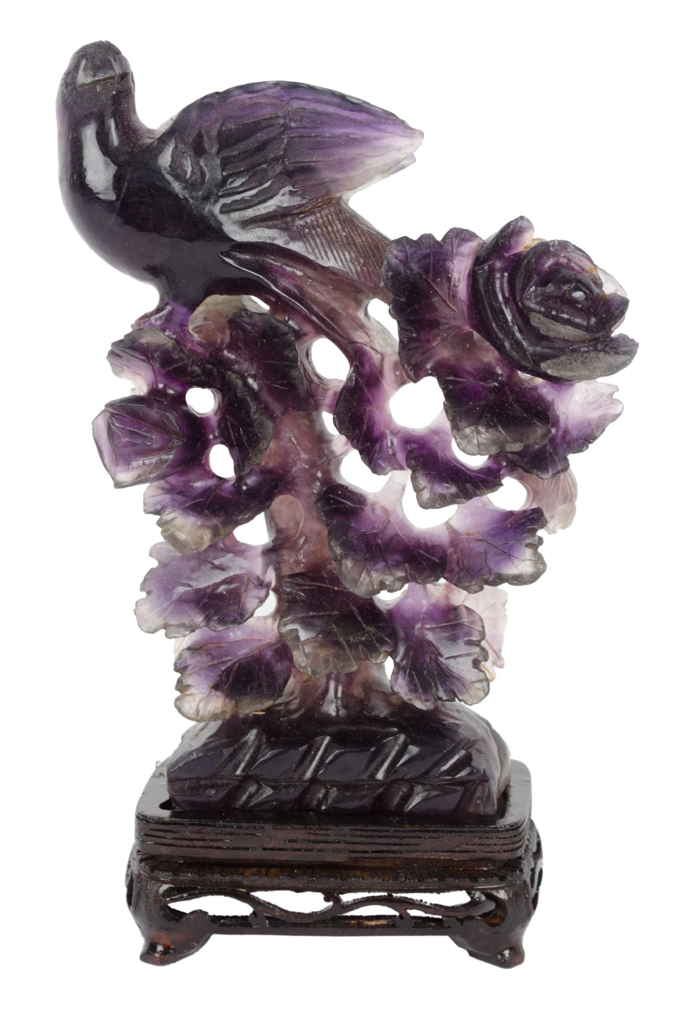 SCUTURA in agata raffigurante "volatile su ramo fiorato", base in legno. Cina XX secolo Misure: h cm 19