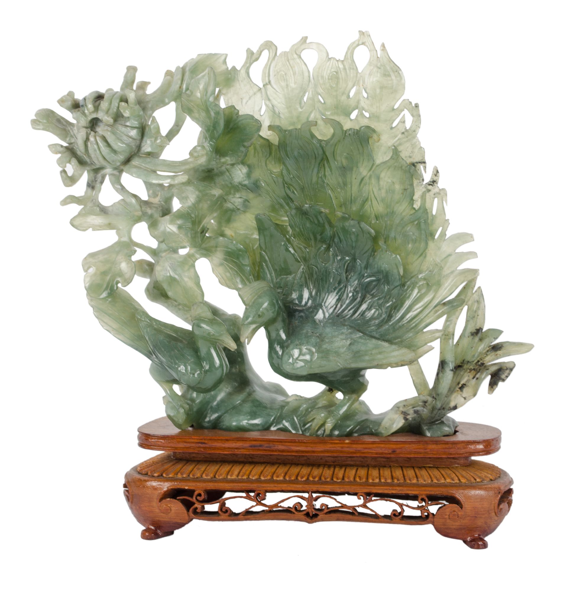 GRUPPO in giada raffigurante "pavoni", base in legno. Cina XX secolo Misure:...