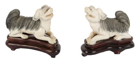 COPPIA SCULTURE in avorio raffigurante "cani di Pho", base in legno. Cina primi '900 Misure: h cm 8
