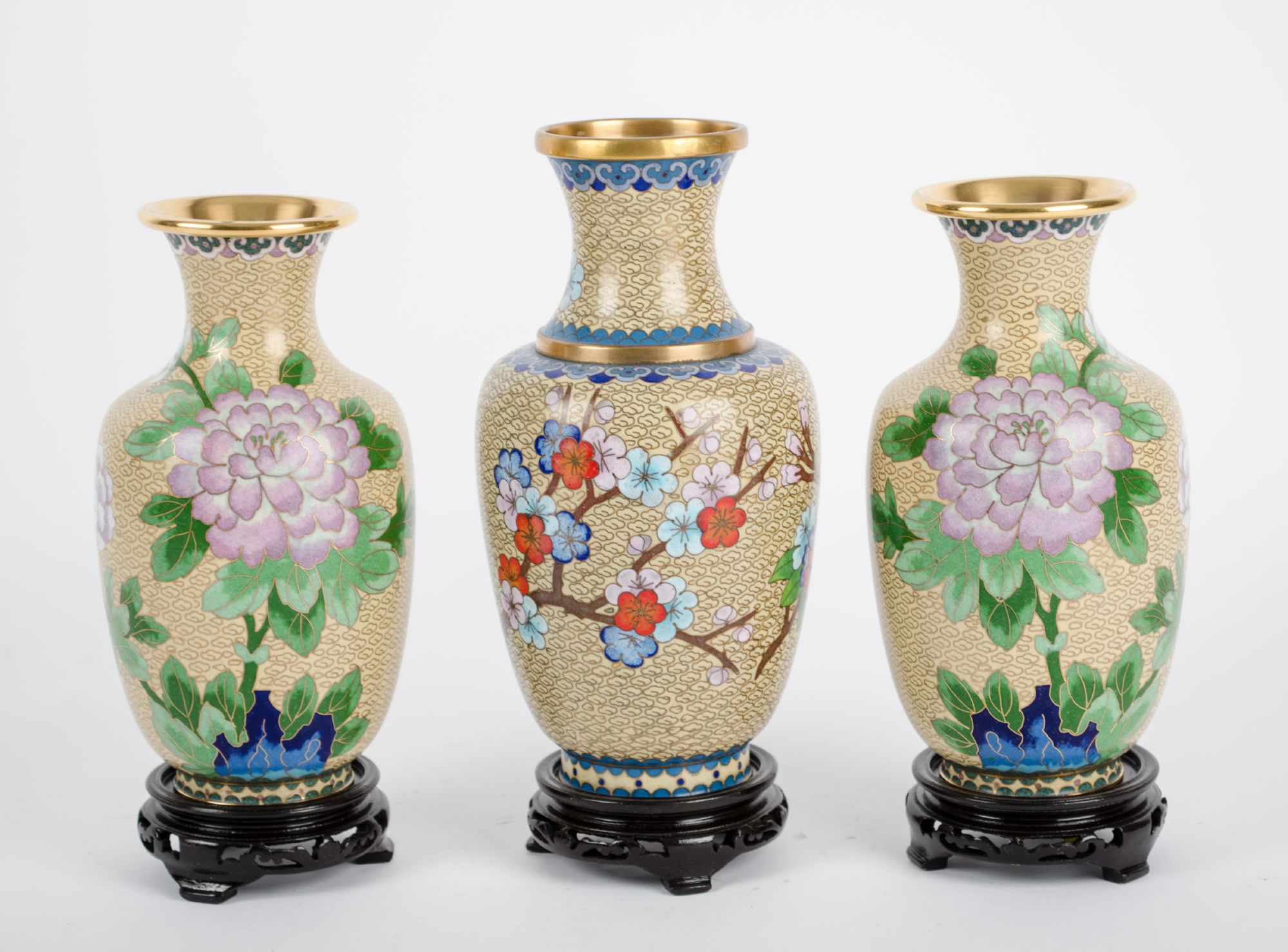 TRE VASI in cloisonnet con basi in legno ebanizzato. Cina XX secolo Misure: h cm 20 - 24 - 21