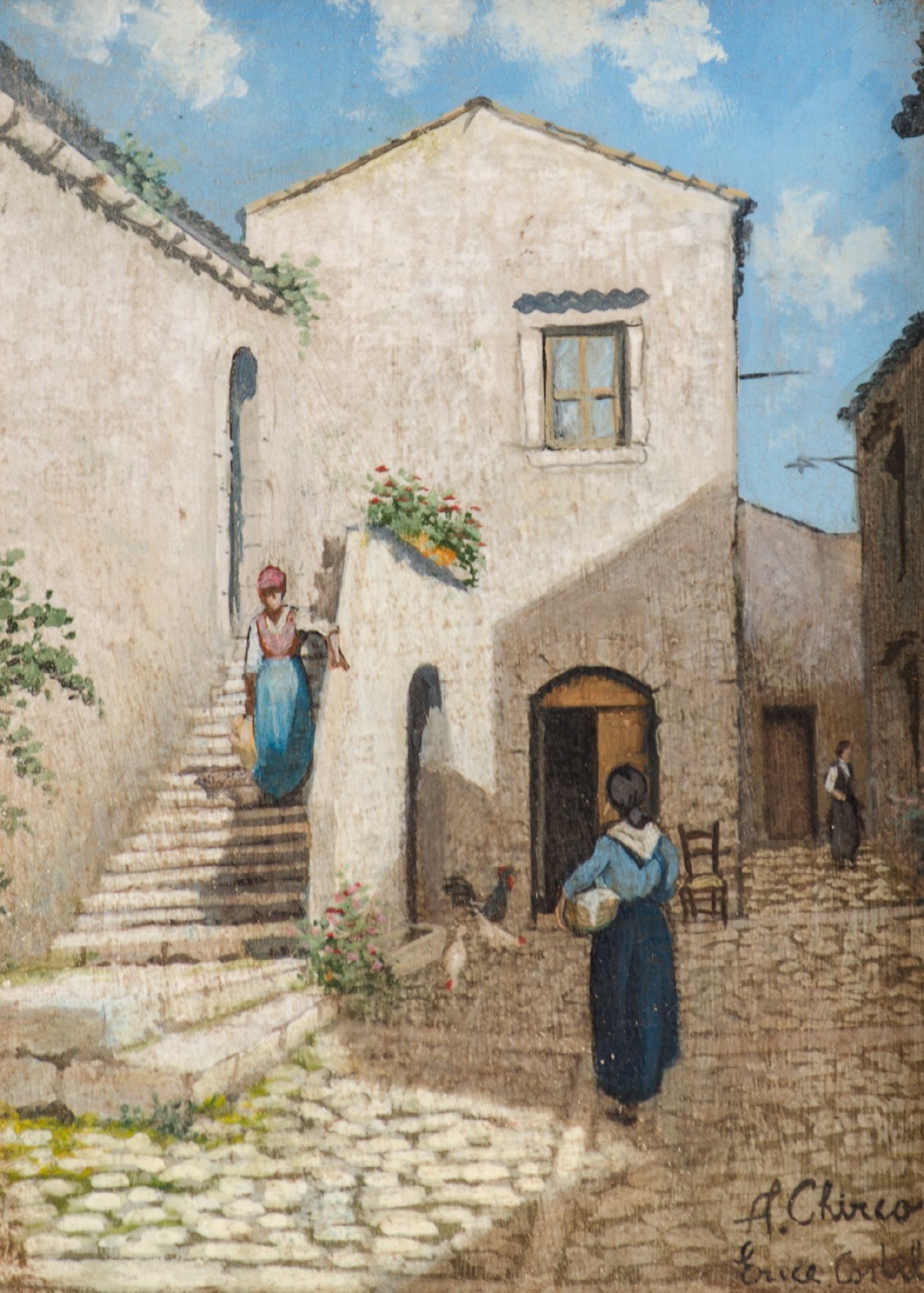 Lotto 693 | OLIO su tavoletta "cortile di Erice", firmato in basso a destra. Misure: cm...