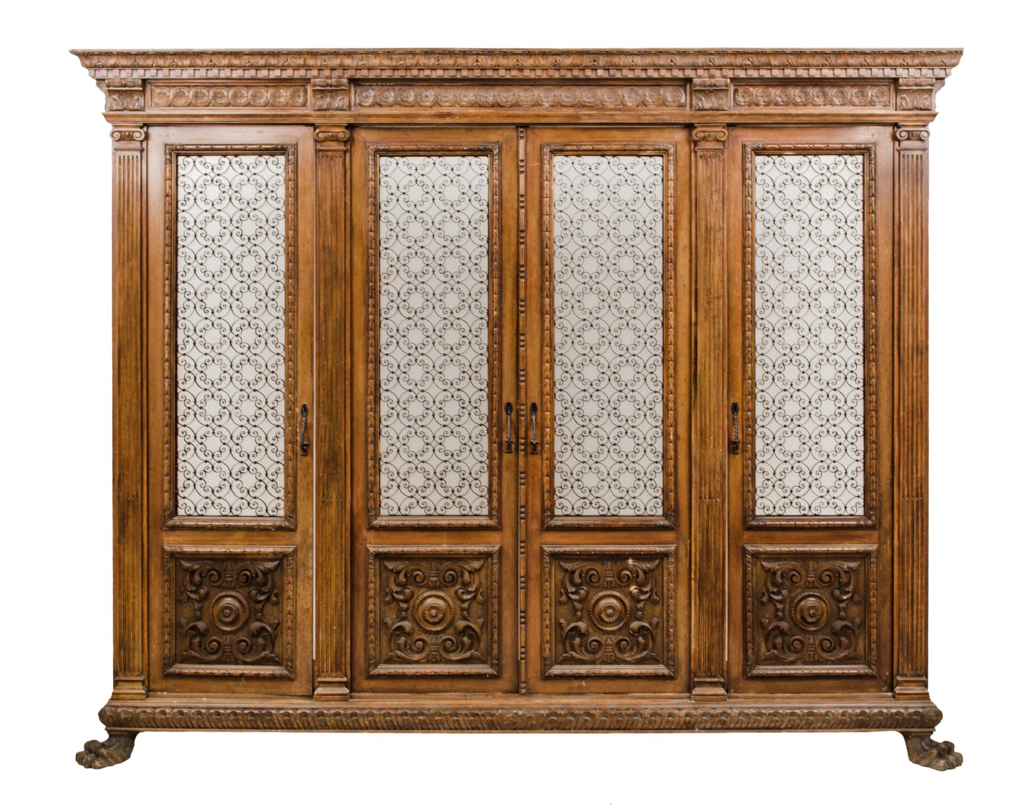 LIBRERIA stile rinascimentale a quattro ante in noce. Sicilia meta' '900 Misure: cm 244 x 54 x h 197