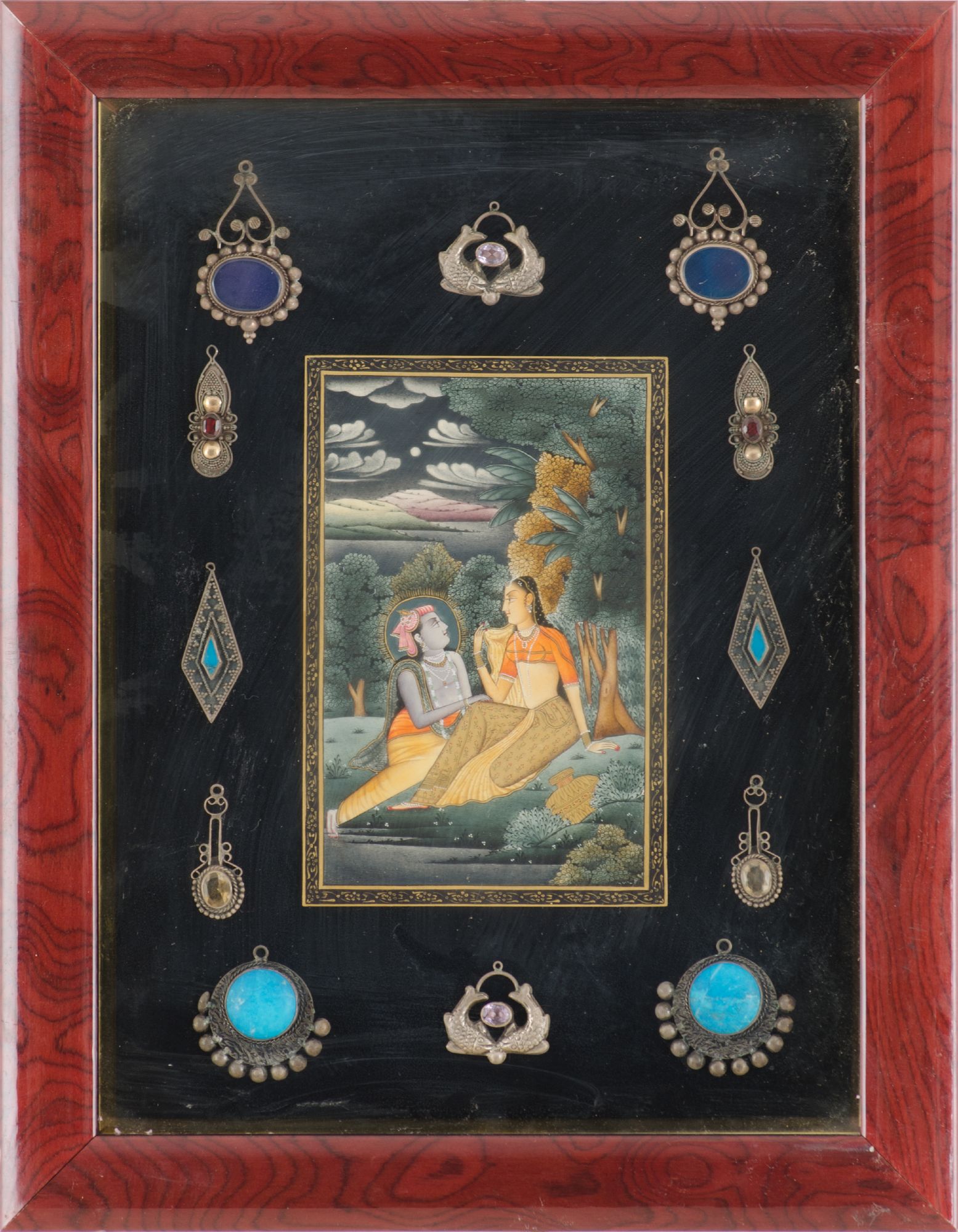 TECNICA mista "scena orientale", guarnita con pendenti di orecchini in argento e pietre dure. XX secolo Misure: cm 20 x 22