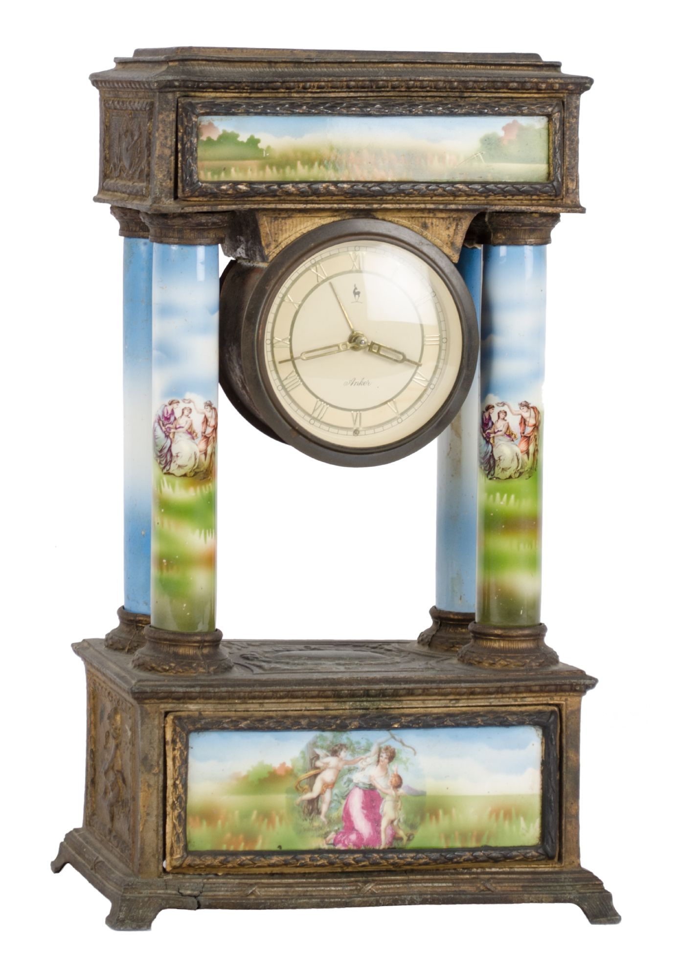 OROLOGIO a tempietto con fronte e colonne in porcellana tipologia Vienna. XX...