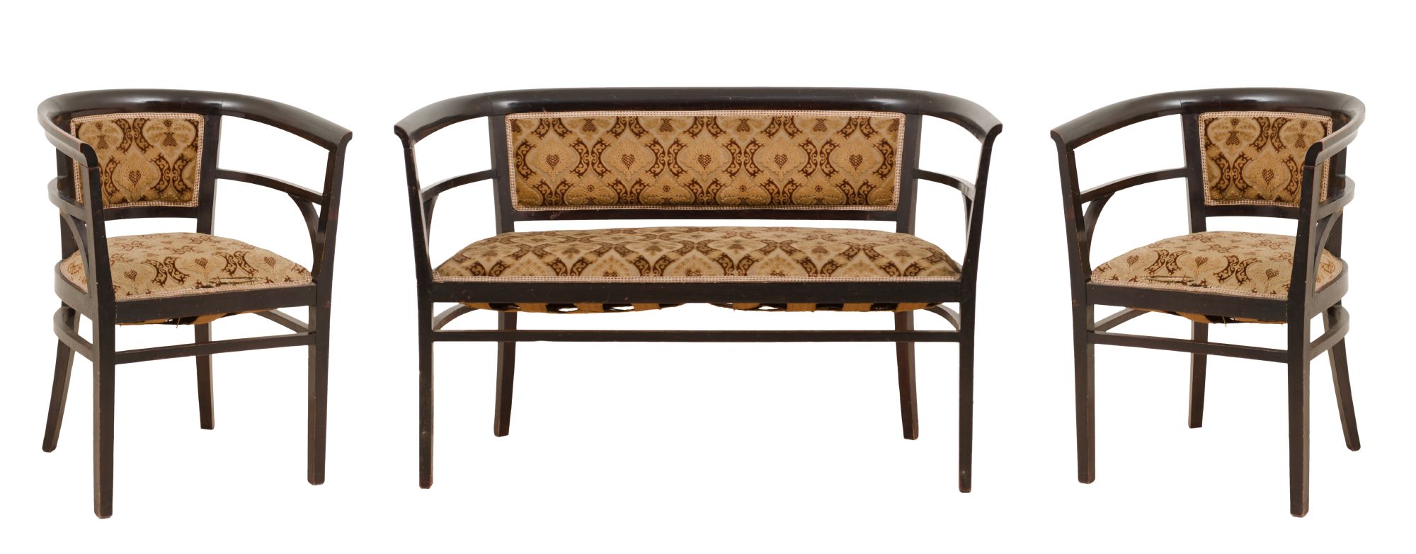 SALOTTO Liberty in faggio composto da DIVANO e da due POLTRONE. Primi '900...