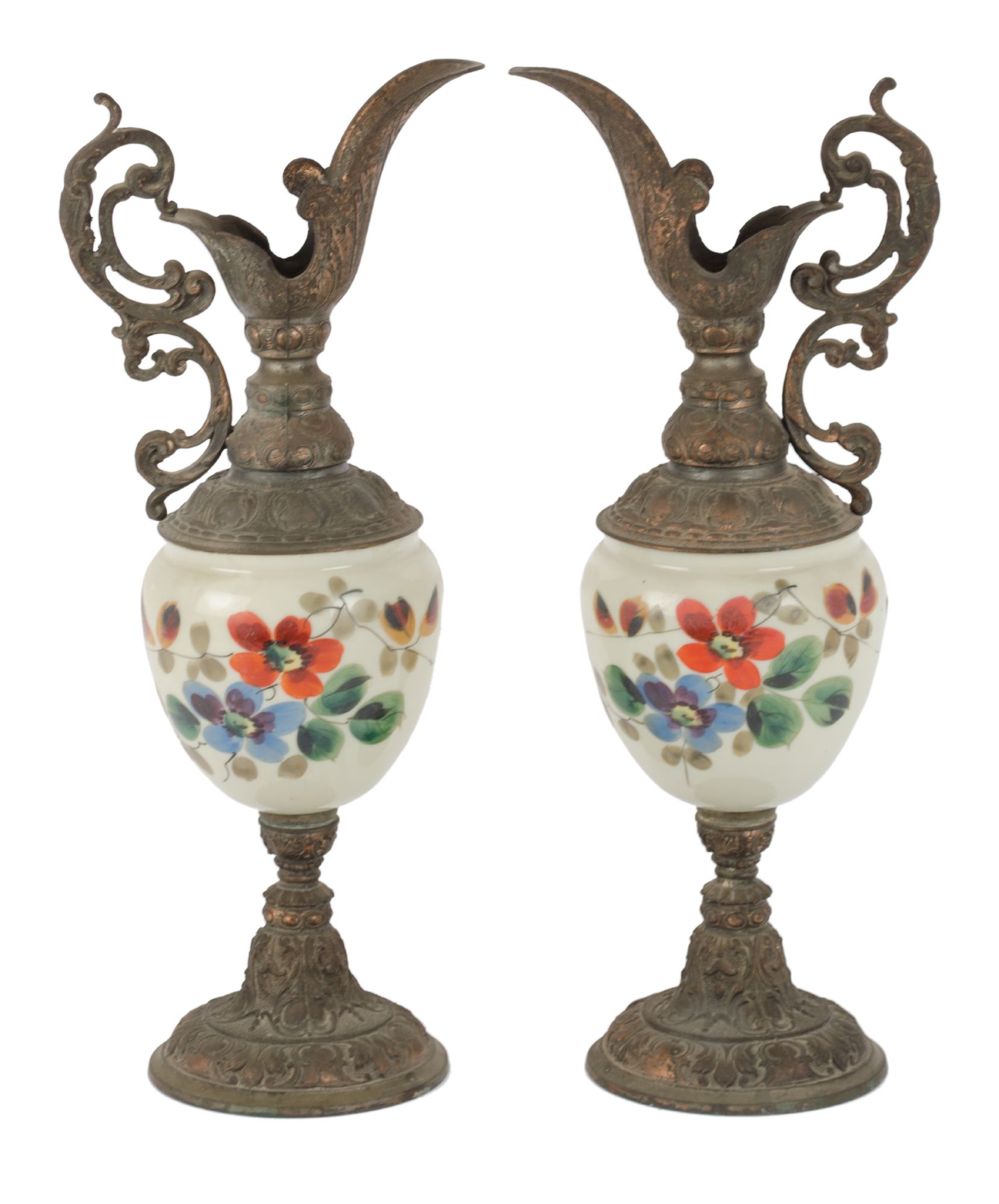 COPPIA ANFORE in antimonio con bocce in opaline decorata a mano. Primi '900...