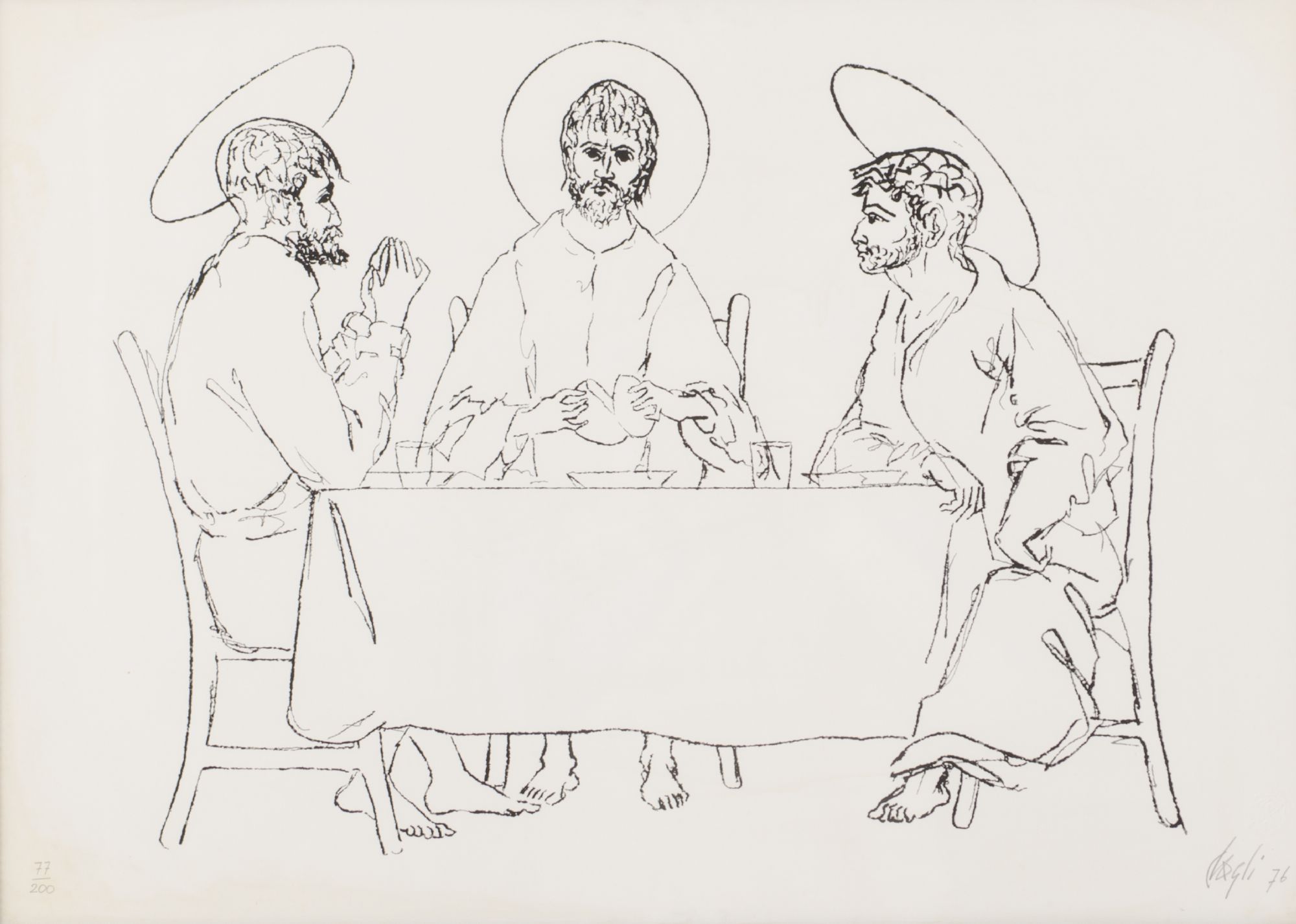 CORRADO CAGLI (Ancona 1910 - Roma 1976) LITOGRAFIA "pasto tra Santi", esemplare 77/200. Datato 1976 Misure: cm 50 x 70