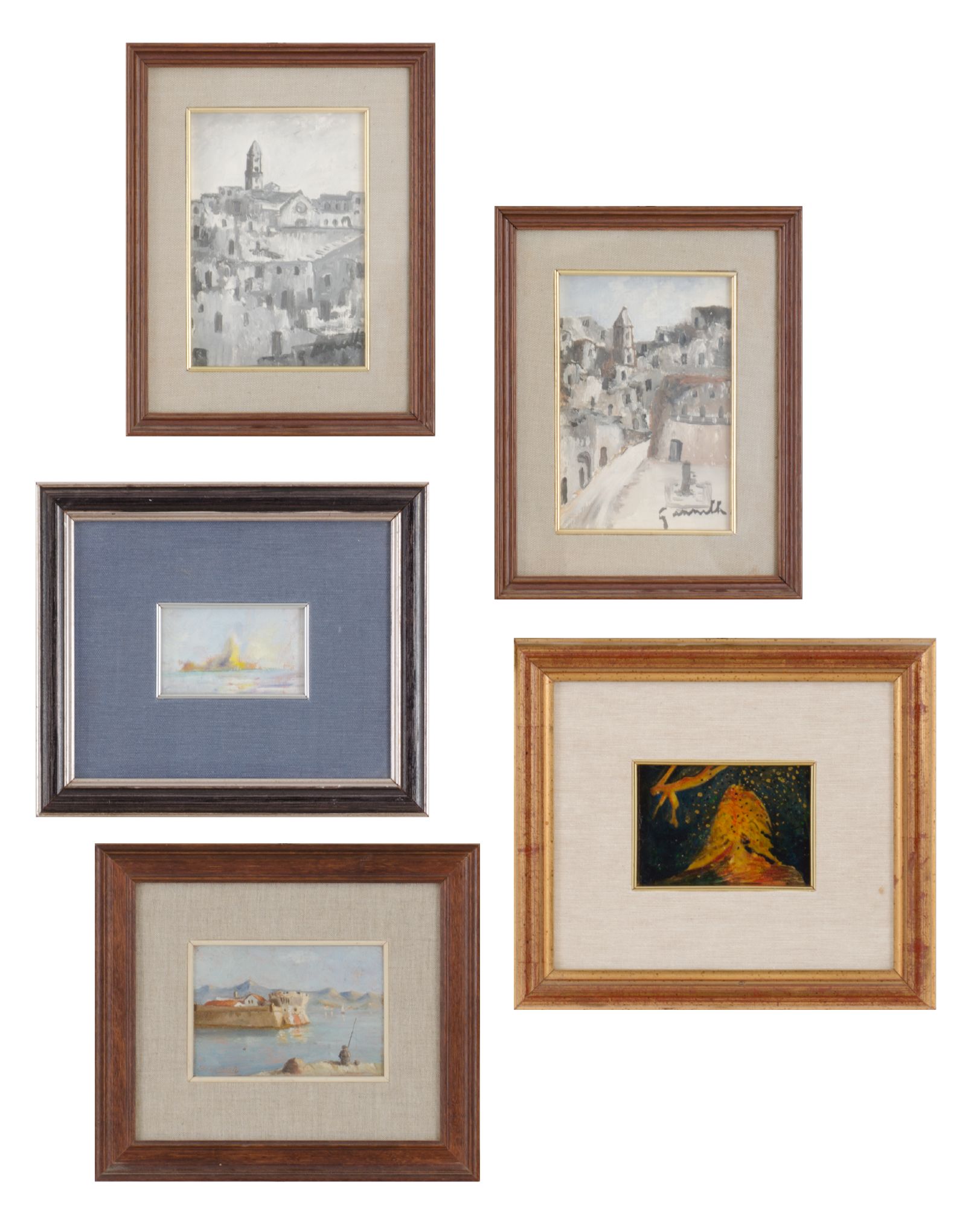 LOTTO composto da due OLI raffiguranti "scorci di paese" OLIO "figura astratta" e da due OLI "paesaggi marini". XX secolo Misure: varie