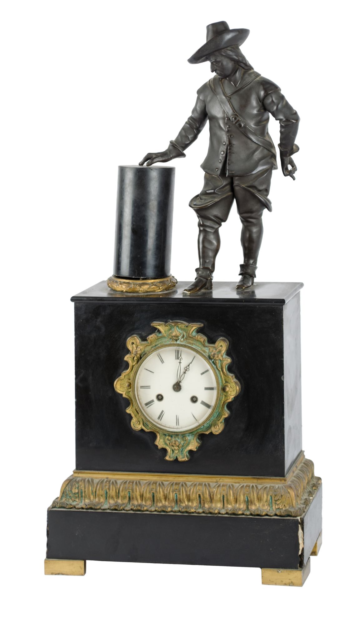 OROLOGIO in marmo nero con scultura in bronzo raffigurante "moschettiere". Francia XIX secolo Misure: cm 30,5 x 15 x h 65,5