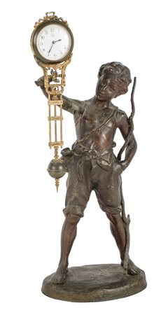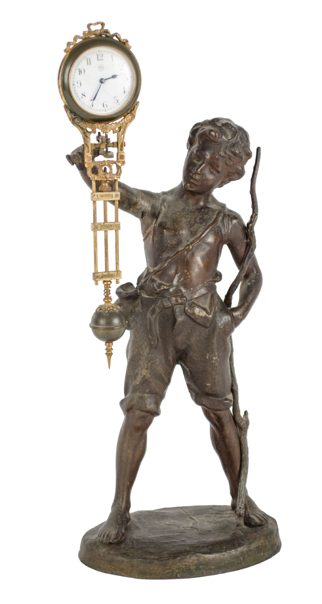 OROLOGIO in metallo sorretto da scultura raffigurante "scugnizzo". XX secolo Misure: h cm 41