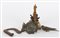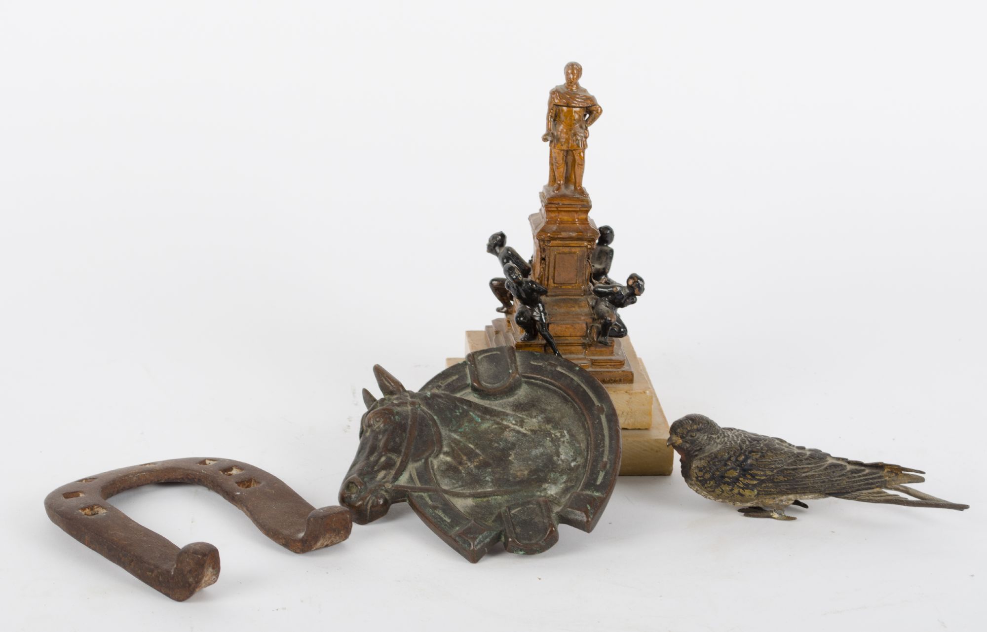 LOTTO composto da FERRO di cavallo, SVUOTATASCHE a guisa di ferro di cavallo, SCULTURA in bronzo raffigurante "volatile" e da SCULTURA in metallo raffigurante "monumento di Livorno". XX secolo Misure: varie