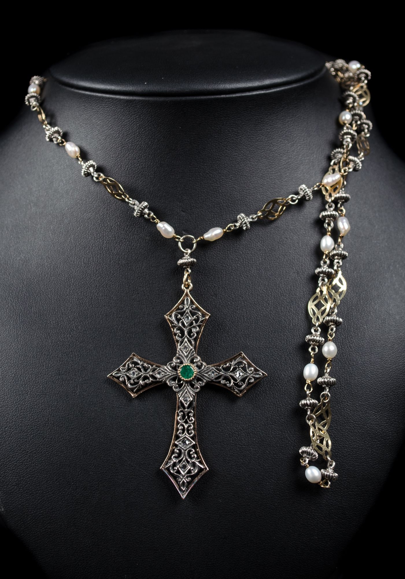 COLLANA in oro basso titolo lavorato intervallato da perline di Fiume e croce pendente in oro basso titlo e coppella con diamanti e smeraldo centrale (rottura).