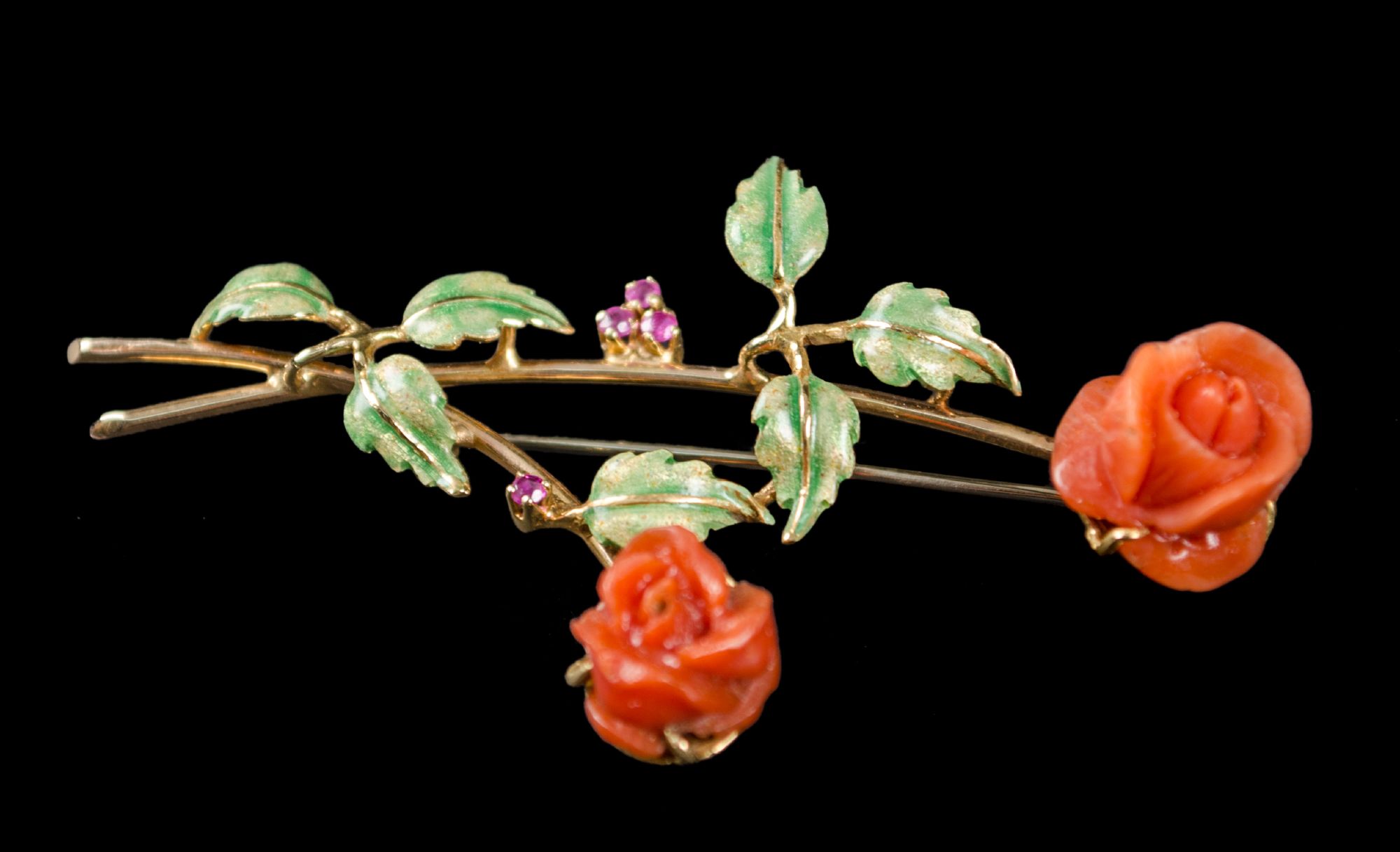 Lotto 854 | SPILLA in oro giallo 18 Kt. e smalti con rose di corallo rosso (g. 10).