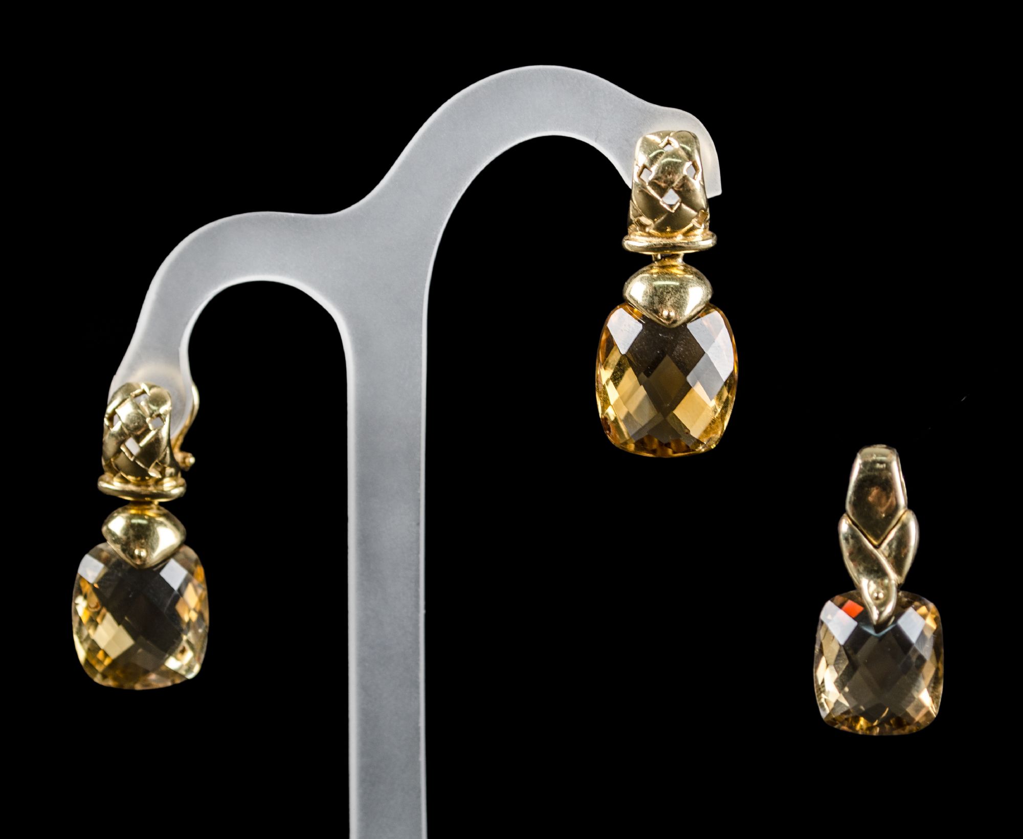 PARURE composta da ORECCHINI e da PENDENTE in oro 18 Kt. con topazi sfaccettati.