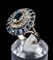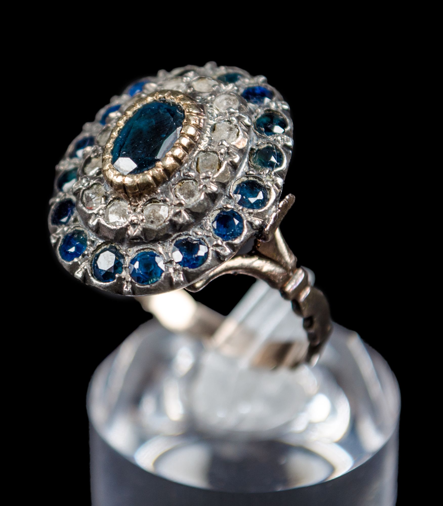 ANELLO in oro basso titolo e coppella con diamanti, zaffiri a giro e zaffiro...