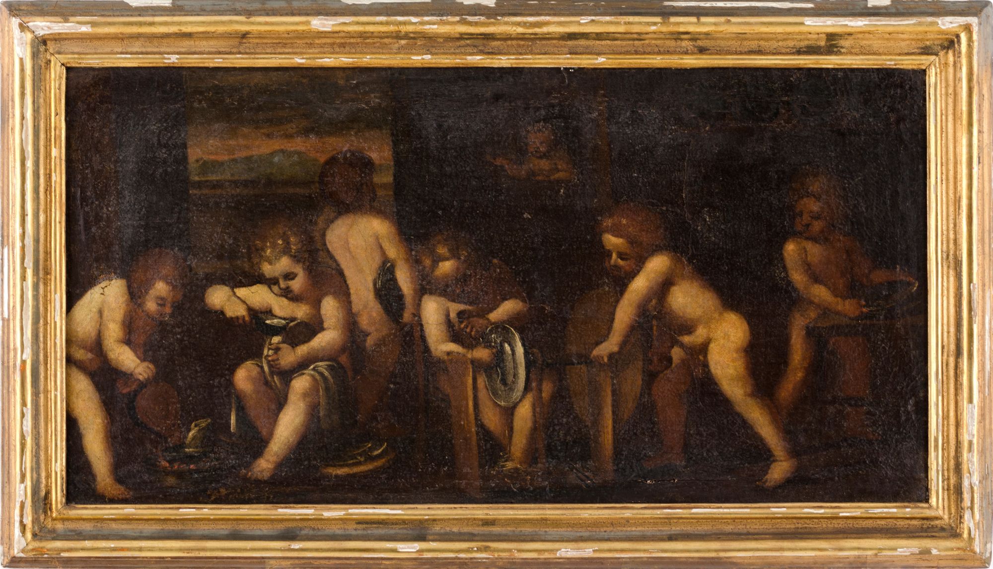 OLIO su tela "putti (mestieri)" entro cornice coeva stile Salvatore Rosa. Italia XVIII secolo Misure: cm 49 x 94
