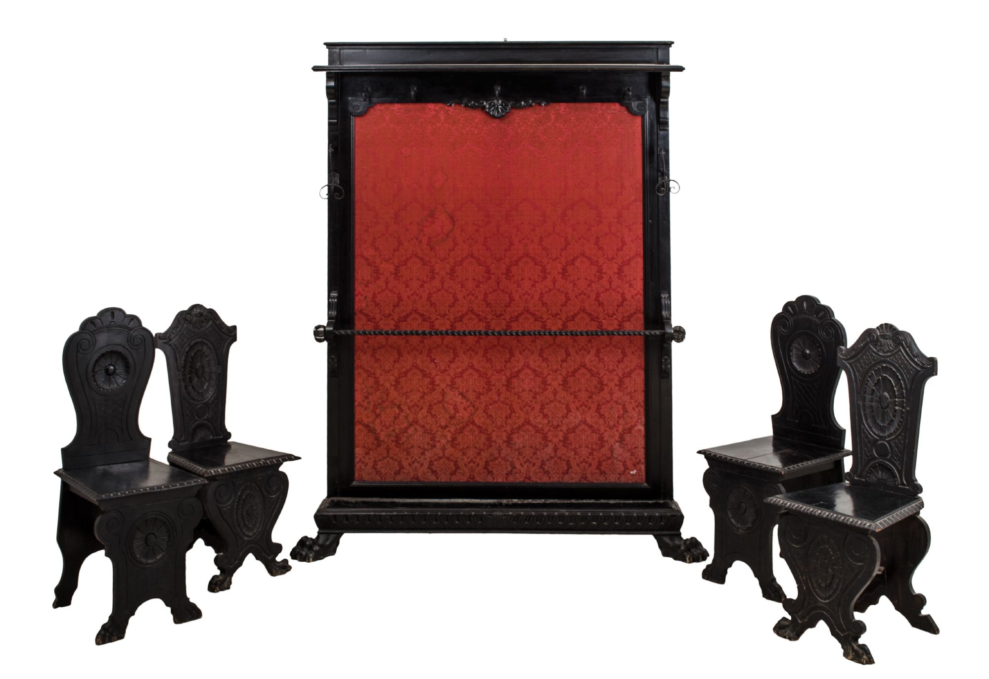 INGRESSO stile rinascimentale in legno ebanizzato composto da BASTONIERA, CASSAPANCA con spalliera e da 4 SEDIE. Sicilia primi '900 Misure: varie