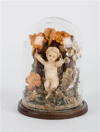 SCULTURA in porcellana raffigurante "Bambinello" entro campana in vetro. XX secolo Misure: h cm 19