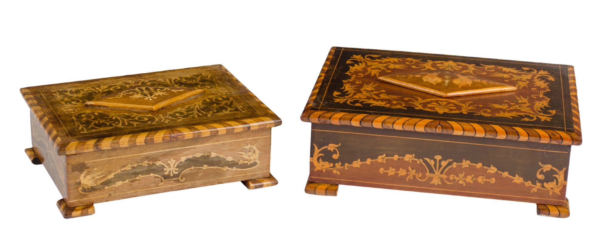 DUE SCATOLE portagioie (una con carillon) in legno riccamente intarsiati in vari tipi di legni. Meta' '900 Misure: varie