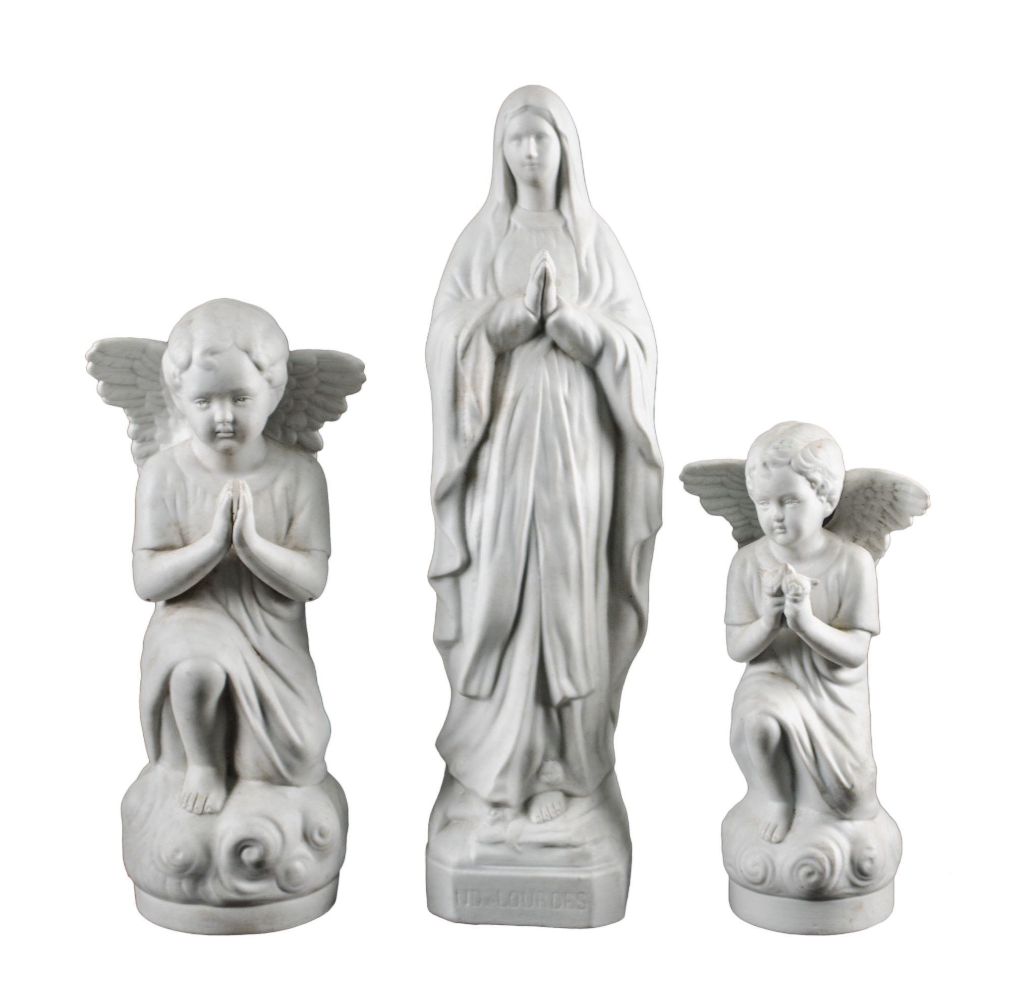 TRE SCULTURE in biscuit "Madonna" e "angioletti". XX secolo Misure: h cm 26 - 21 - 25
