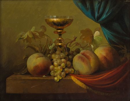 OLIO su tavoletta "natura morta" firmato a destra entro cornice in legno e pastiglia dorata ed in parte ebanizzato. Primi '900 Misure: cm 30 x 40